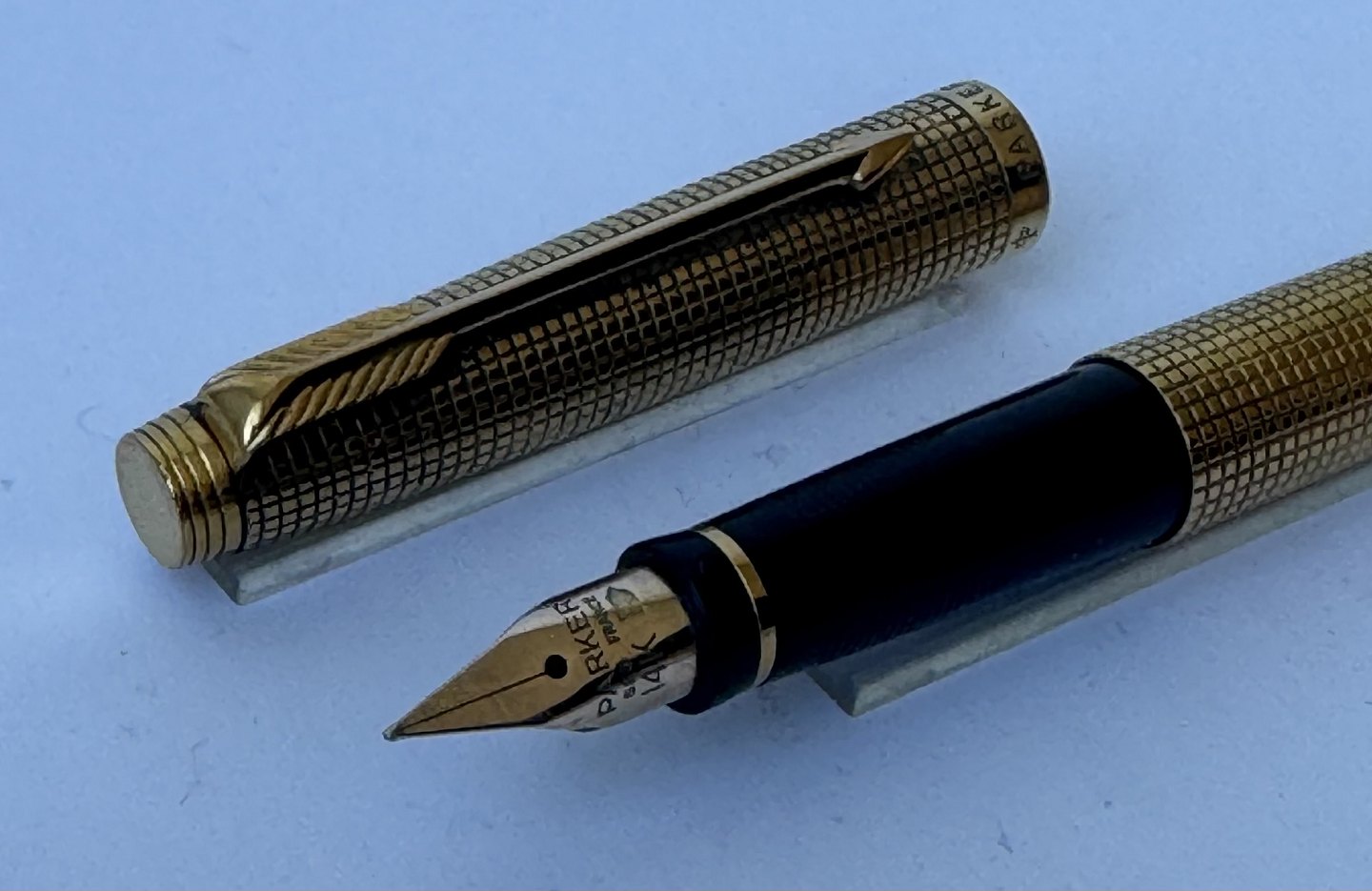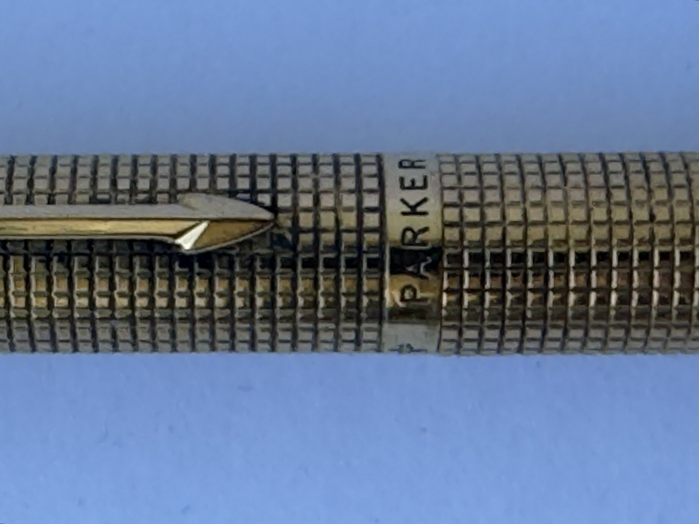 Beskrivelse: Parker 75 Cicelé fyldepen med ternet mønster på overflade i guld-double. Fremstillet i U.S.A. i 1970’erne. Fuldt funktionsduelig. Fin overflade uden stød eller andre overflade brugsspor. Har dog brug for at blive pudset. For enden en 14 karat 585 guldspids fremstillet i Frankrig. L. 13 cm.
