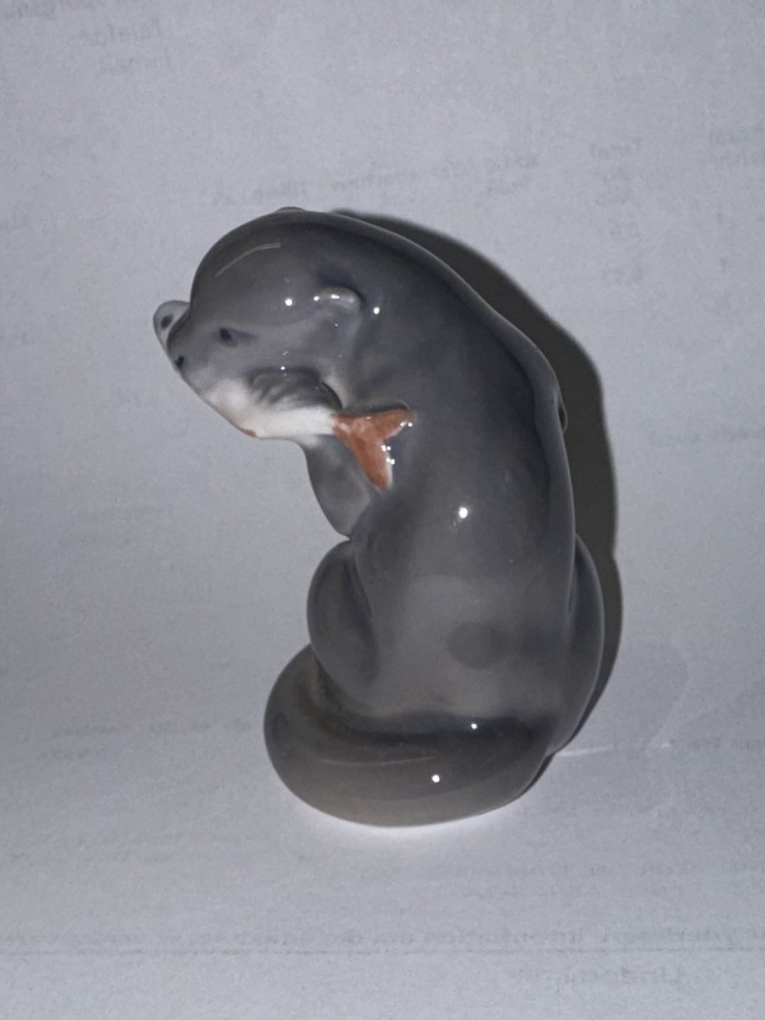 Beskrivelse: Figur i porcelæn af odder med fiskefangst i munden fra Royal Copenhagen. 2. Sortering. I god stand uden skader eller reparationer. Fabriksmærket samt Modelnummer 2333 på bunden. H. 5 cm