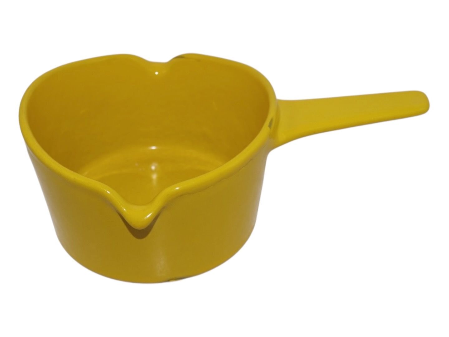 Beskrivelse: Copco Danmark, lille gul emalje støbejerns kasserolle.