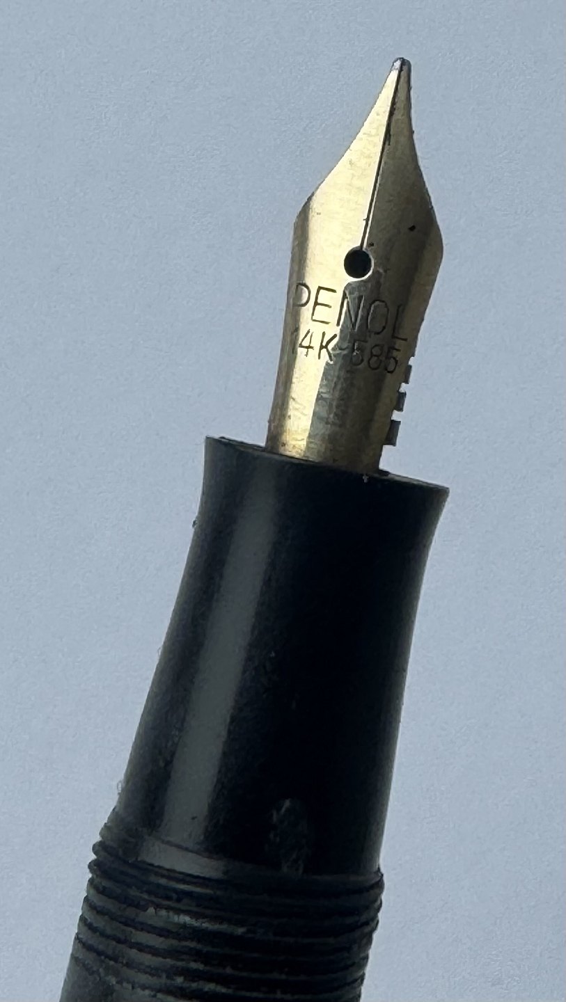 Beskrivelse: Mindre koralrød Penol Junior 12 fyldepen. Push button filler. Der skal indsættes en ny gummisæk før den igen kan optage blæk og skrive igen. Ny gummisæk kan indsættes for et tillæg på kr. 250,- Alle dele originale til denne model. Ingen skader eller reparationer. Lette almindelige brugsspor på overfladen. Længde 11,7 cm