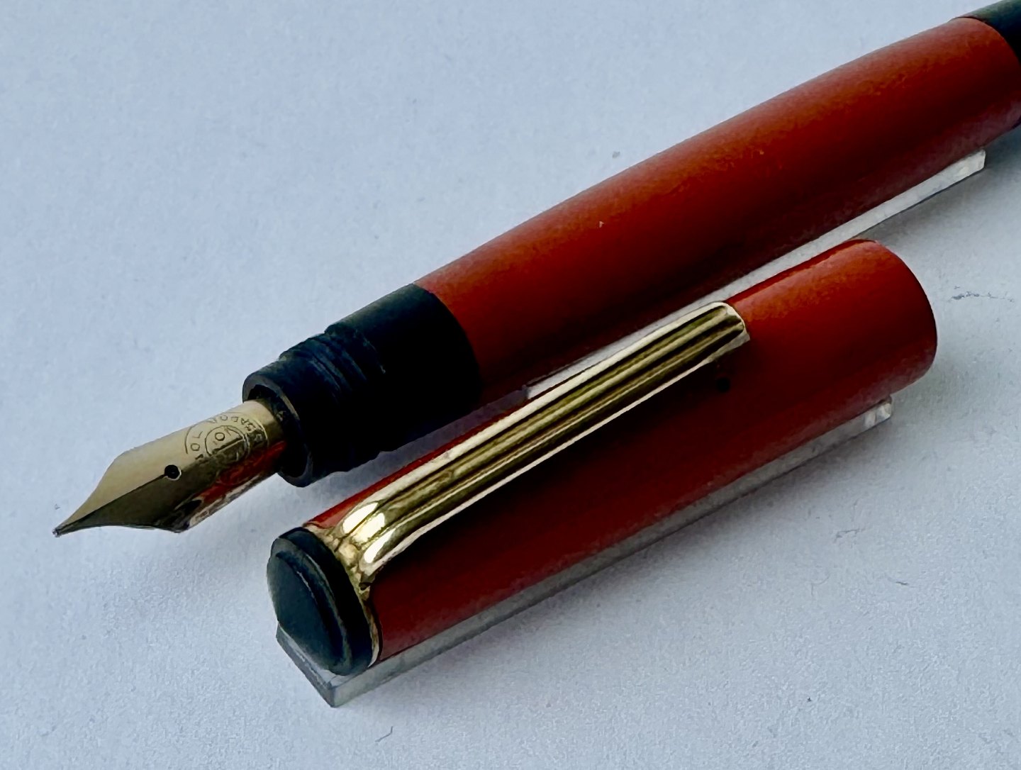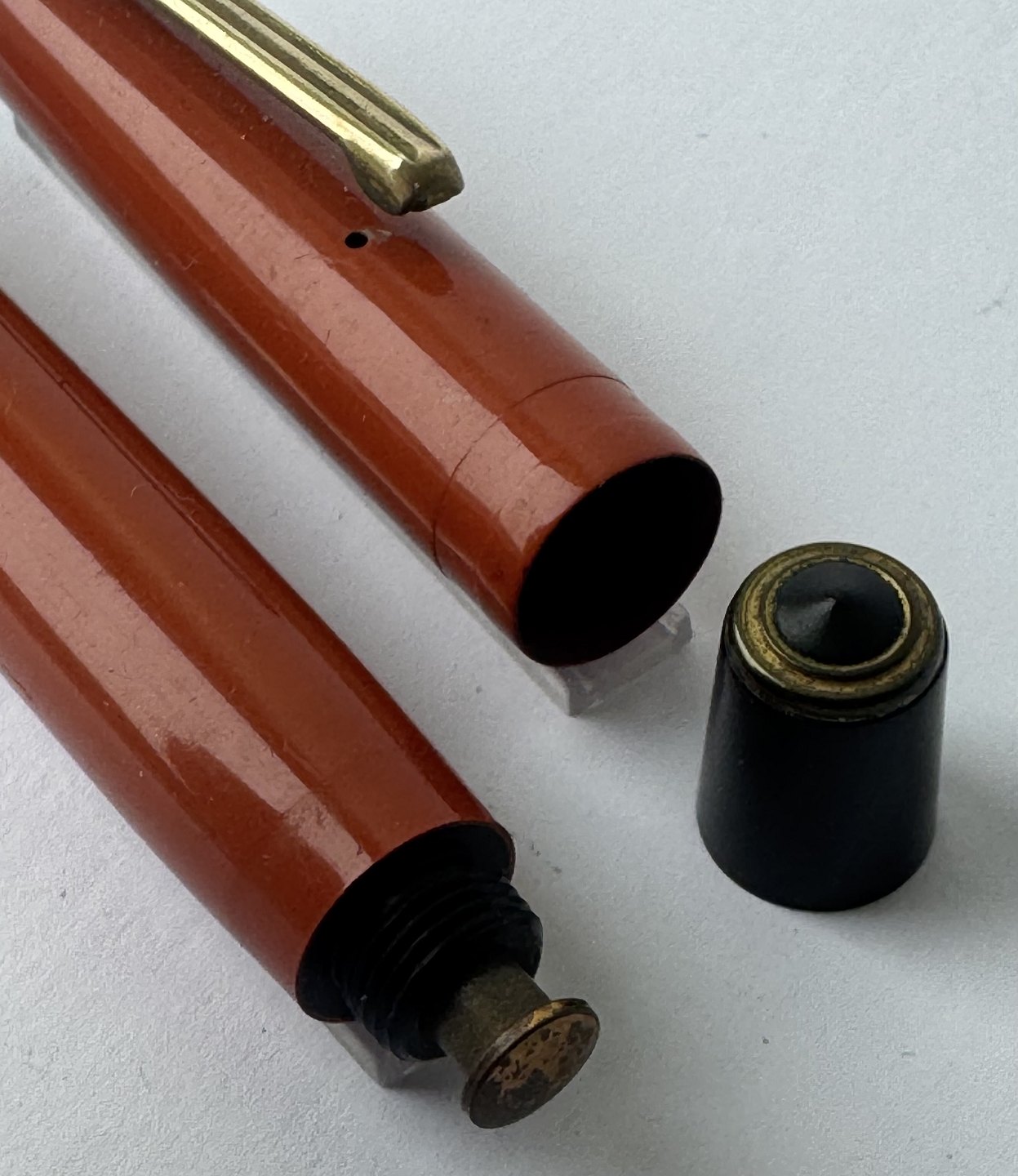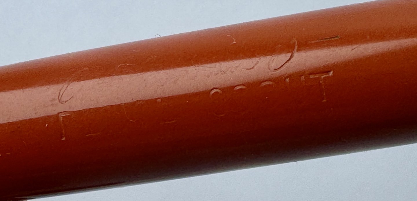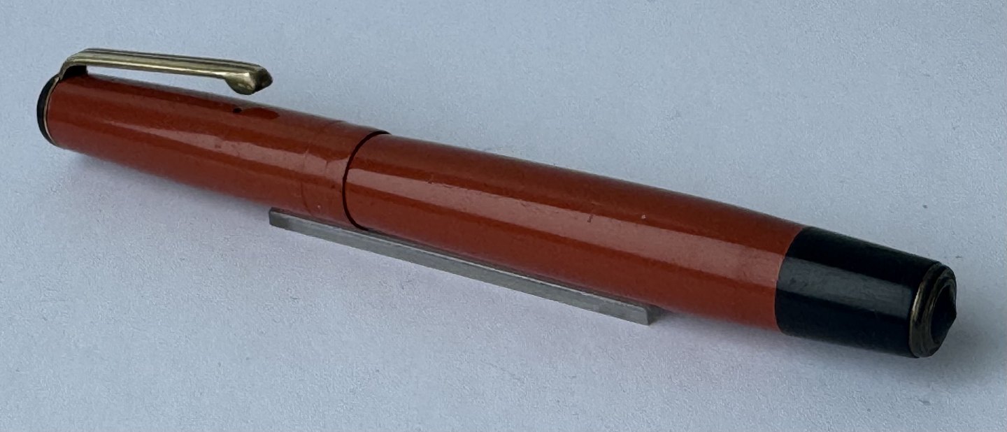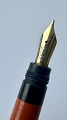 Beskrivelse: Mindre koralrød Penol-Scout Ambassador fyldepen. Push button filler. Der skal indsættes en ny gummisæk før den igen kan optage blæk og skrive igen. Ny gummisæk kan indsættes for et tillæg på kr. 250,- Alle dele originale til denne model. Ingen skader eller reparationer. Lette almindelige brugsspor på overfladen. Længde 11,7 cm