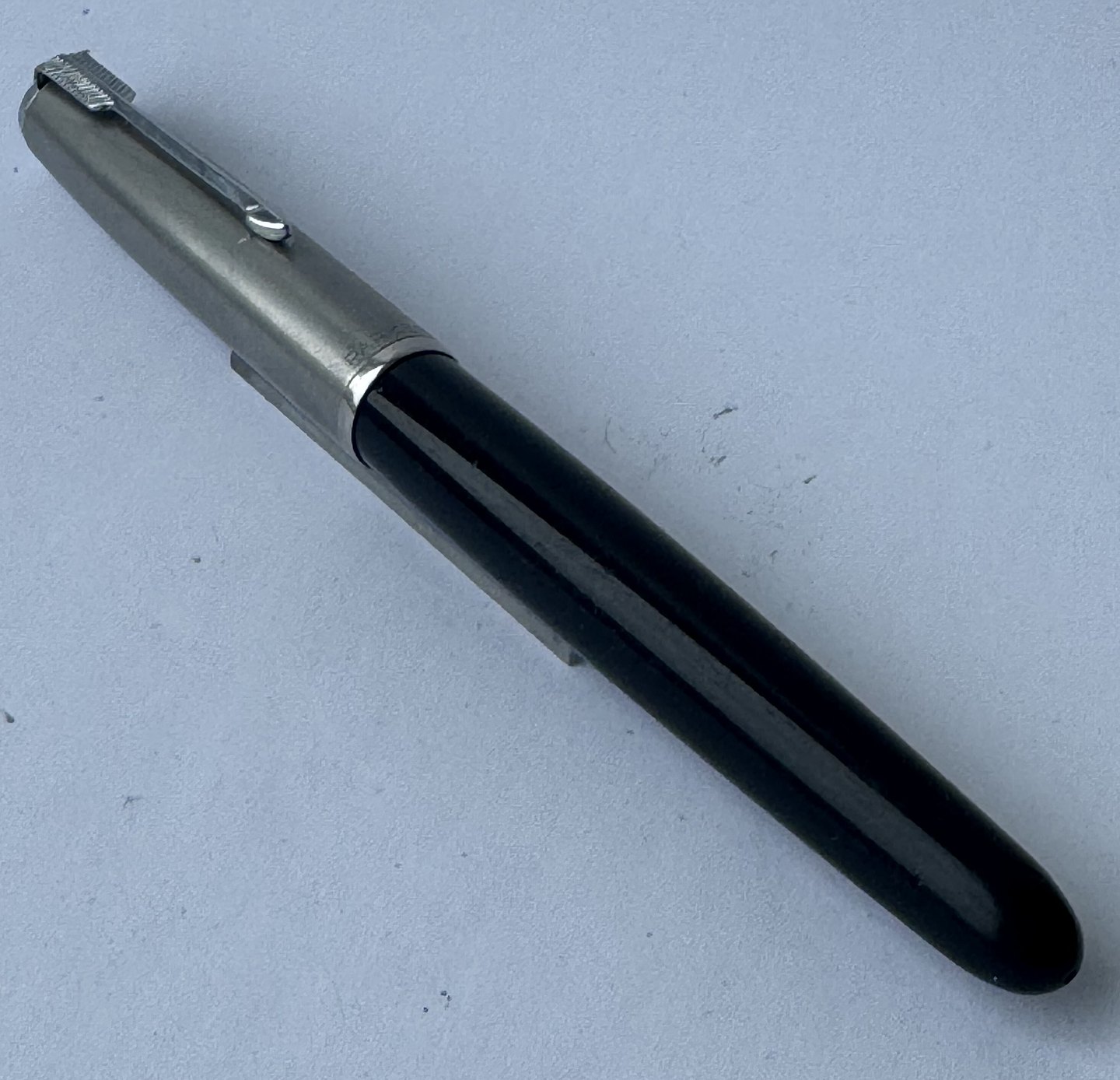 Beskrivelse: Sort Parker 51 fyldepen med hætte i stål fra 1950’erne. Fremstår i god og funktionsdygtig stand. Ingen fejl eller mangler at beskrive. På siden ses “the danish anchor”, som er fyldepenne producenten og forhandleren Christian Olsens firmalogo. Fyldepenne der var importeret til Chr. Olsens fabrikker blev stemplet med dette logo lige såvel som virksomhedens egne produkter, eksempelvis Penol.
