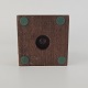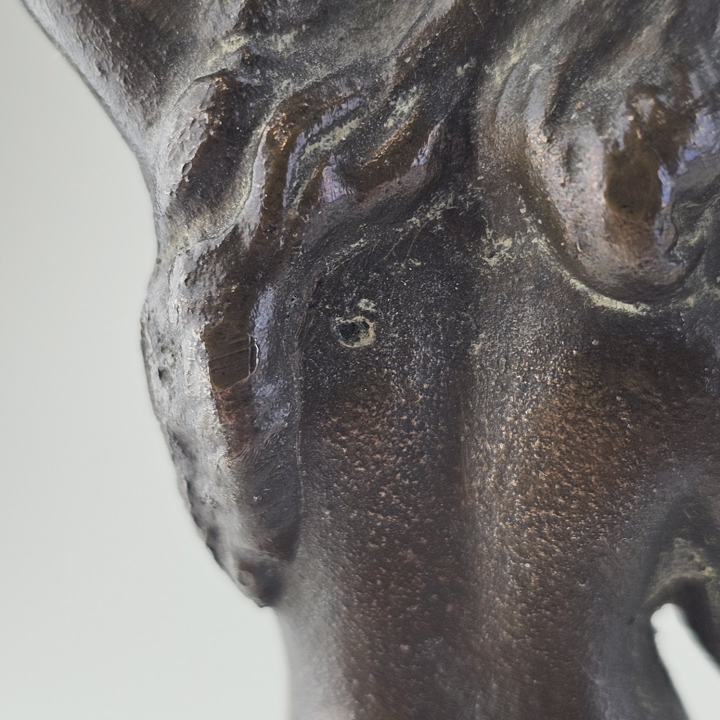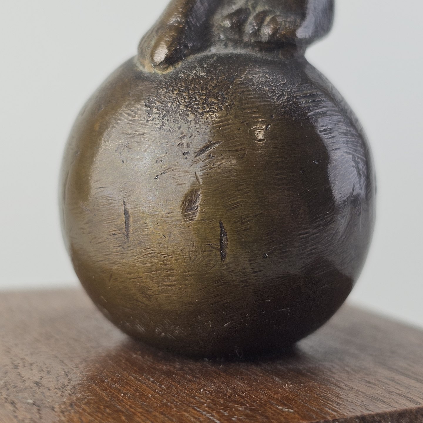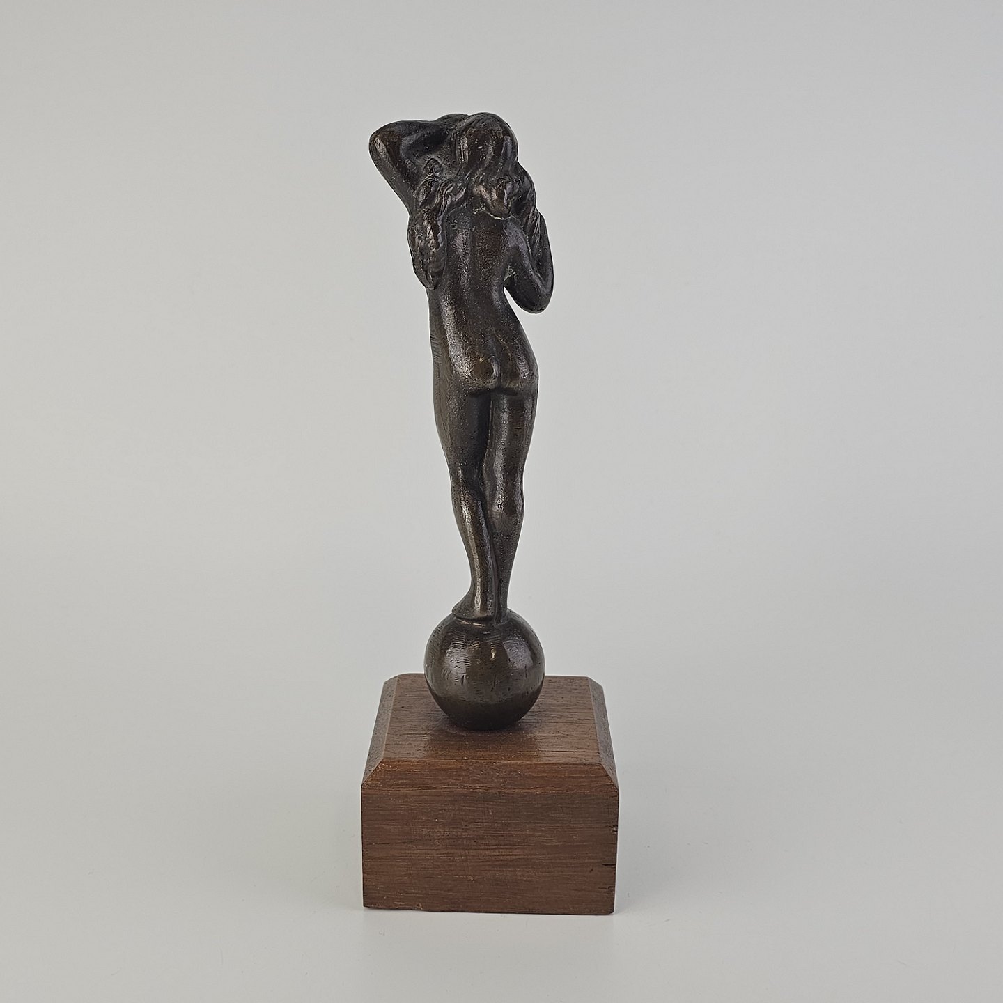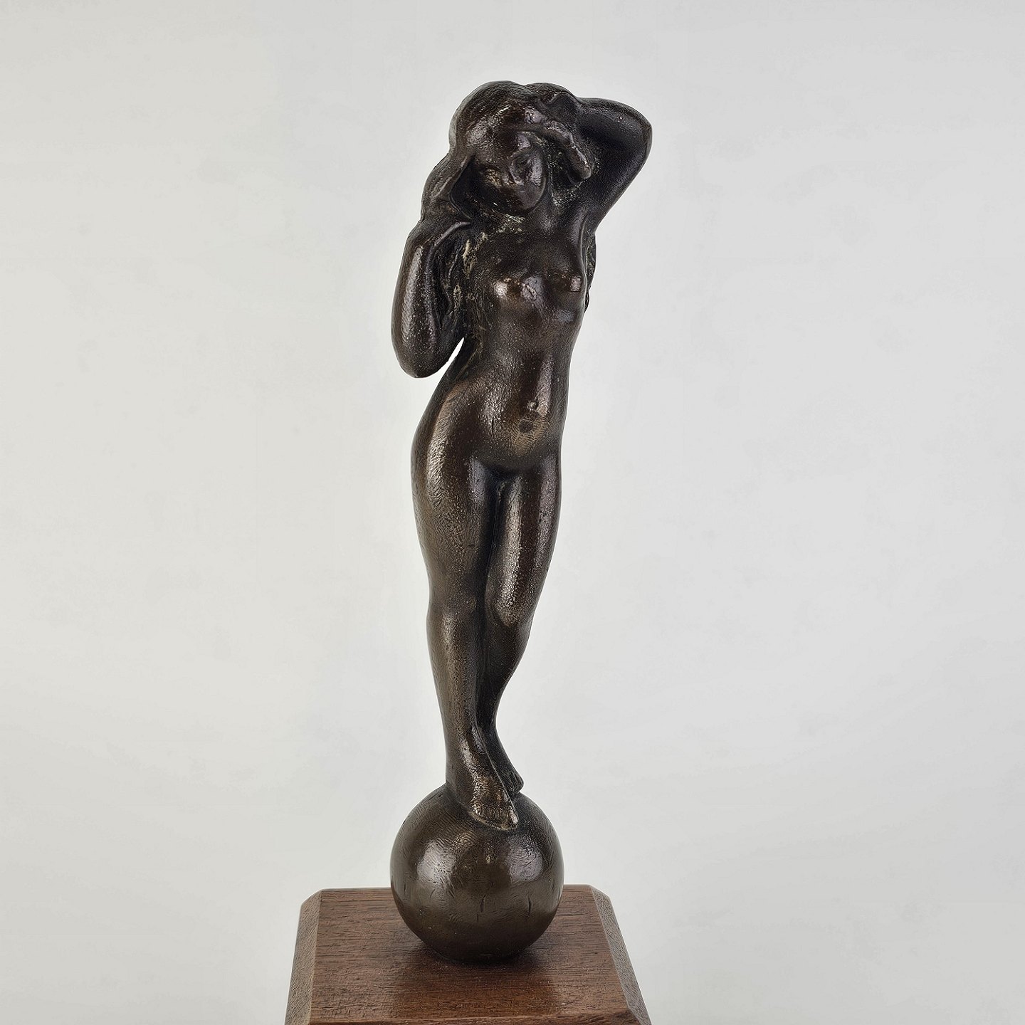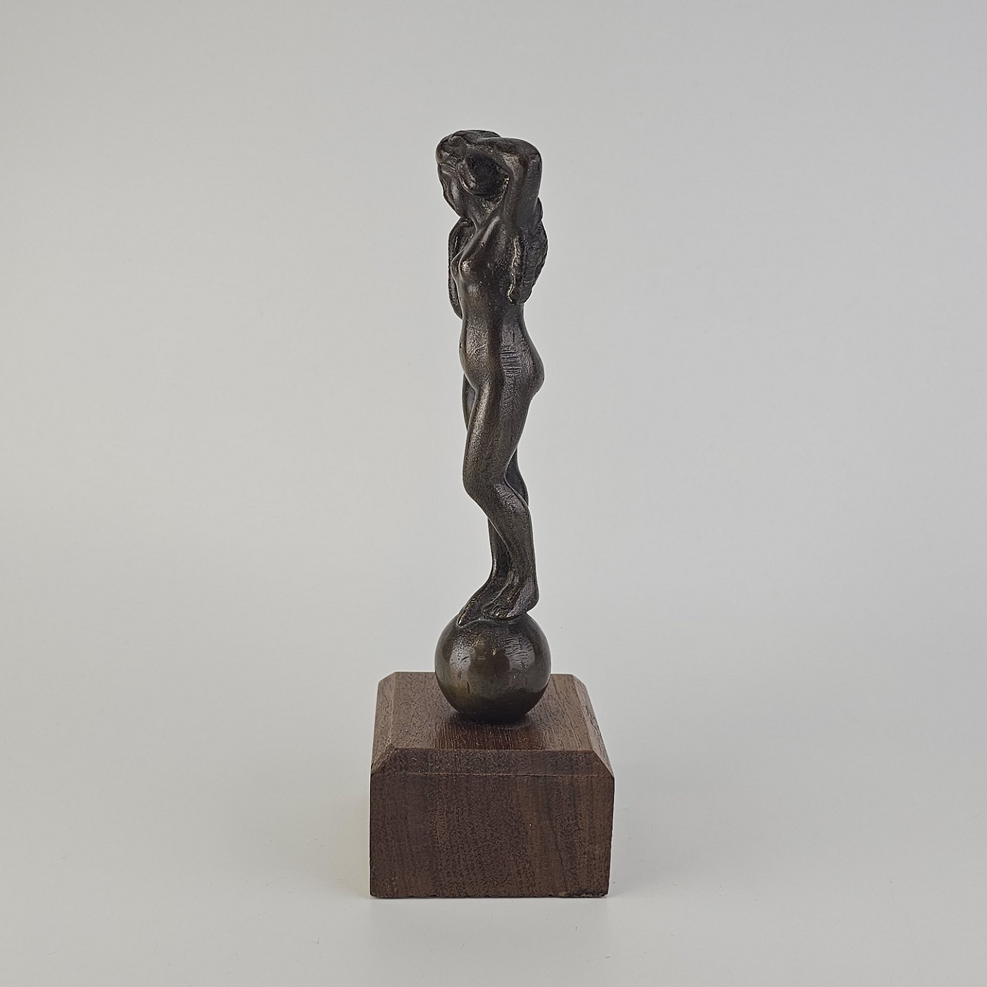 Beskrivelse: Figur med motiv af en kvinde på træsokkel, bruneret messing