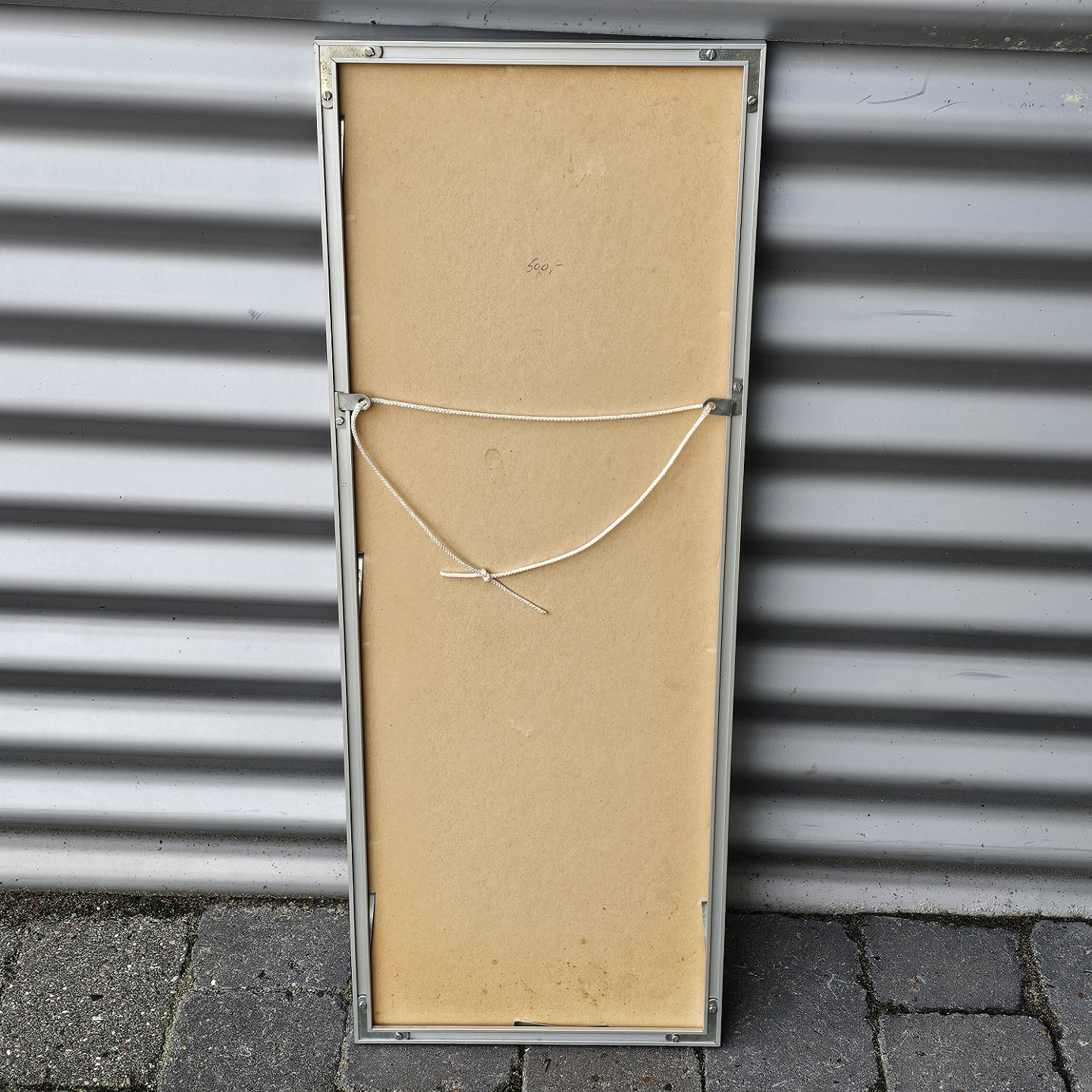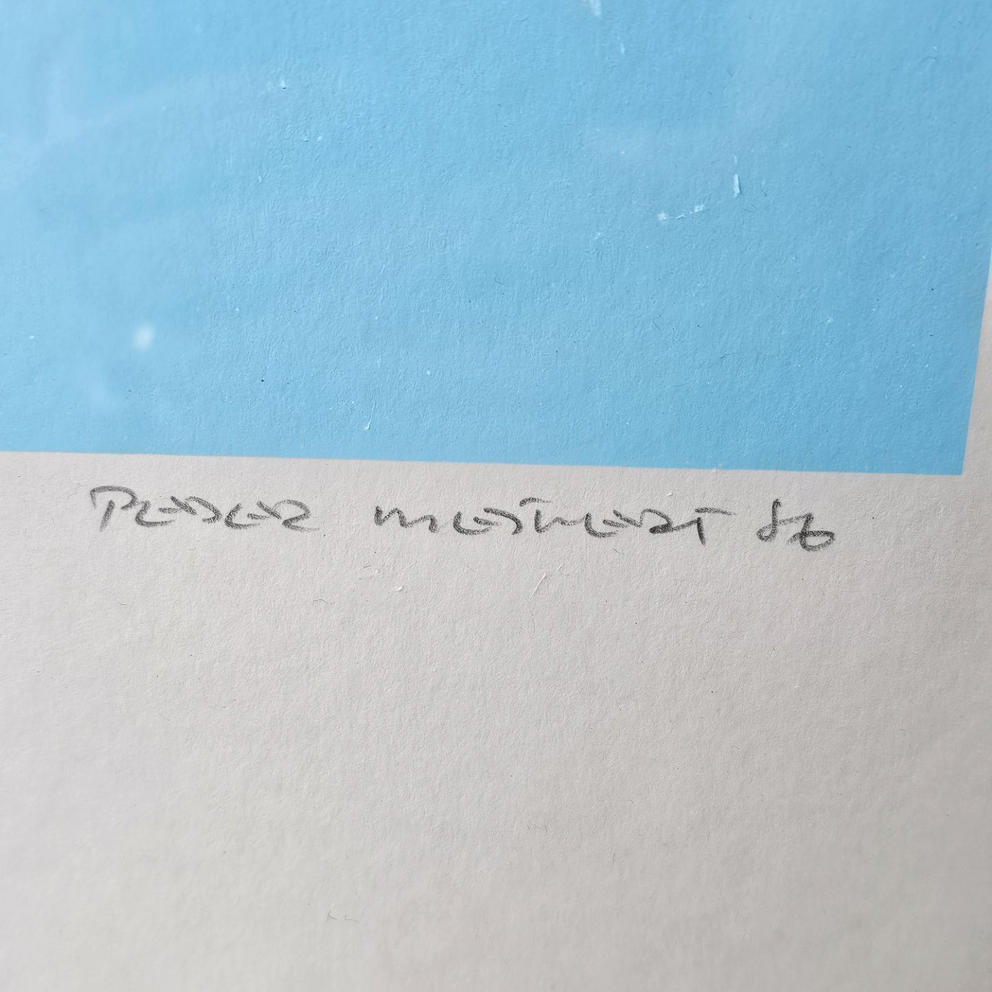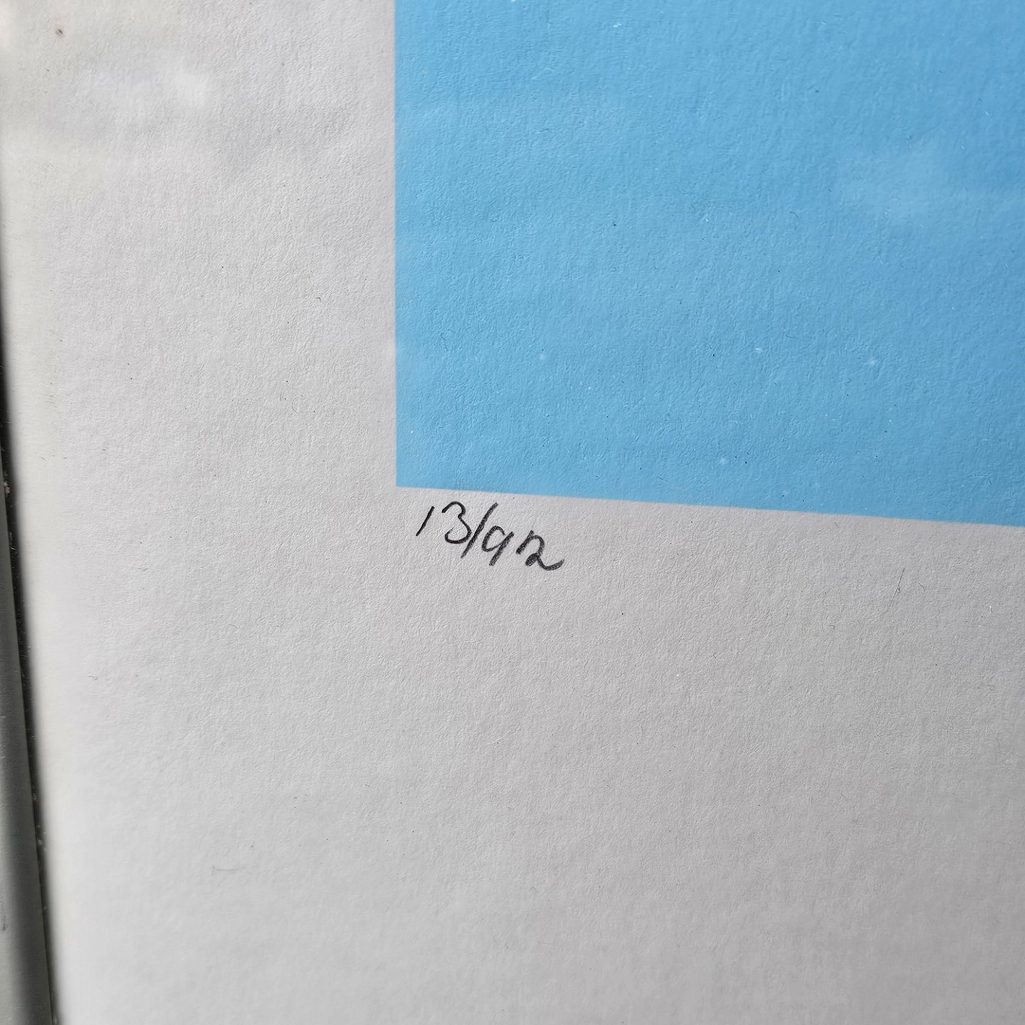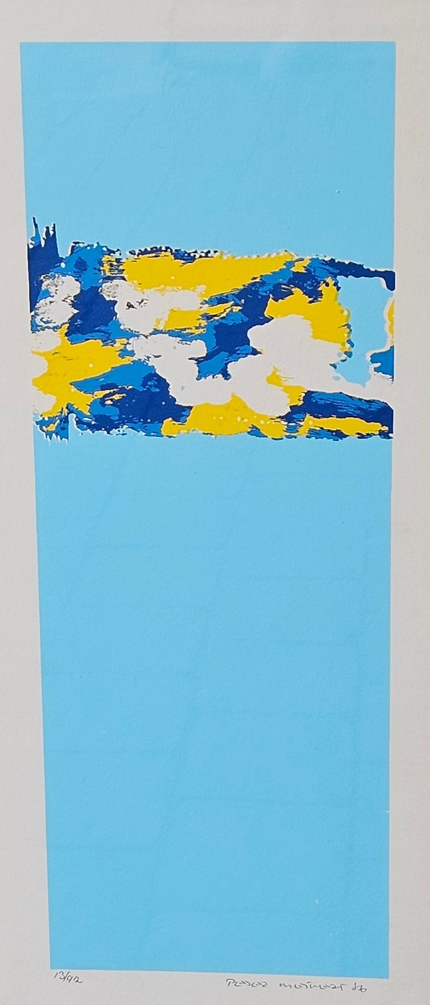 Beskrivelse: Litografi med blå, hvide og gule farver på lyseblå baggrund i metal ramme. 13/92