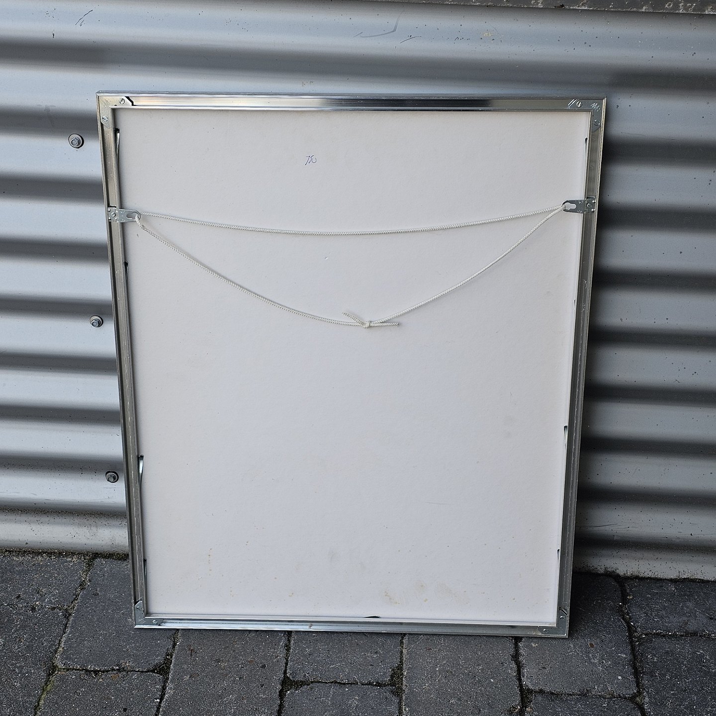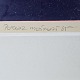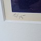 Beskrivelse: Litografi i rød og mørkeblå med baggrund af brosten i metal ramme. 13/45