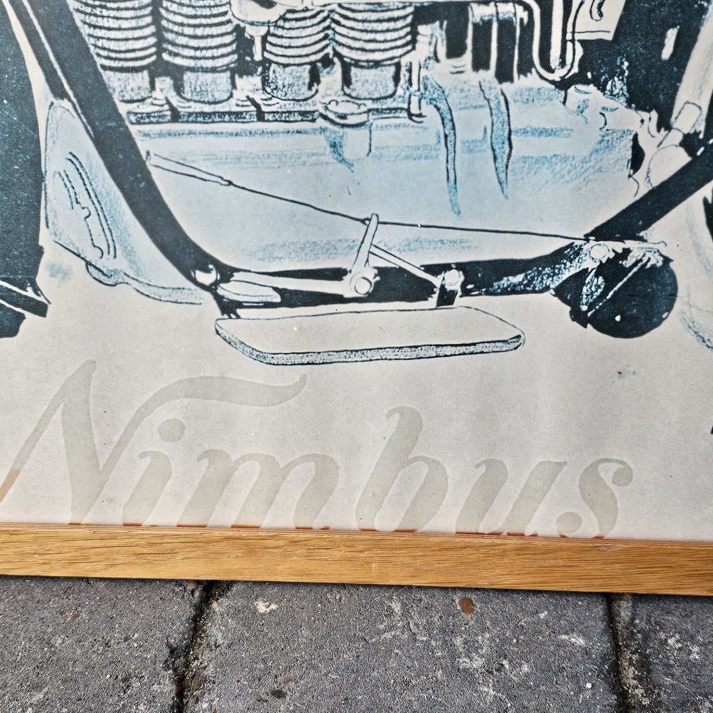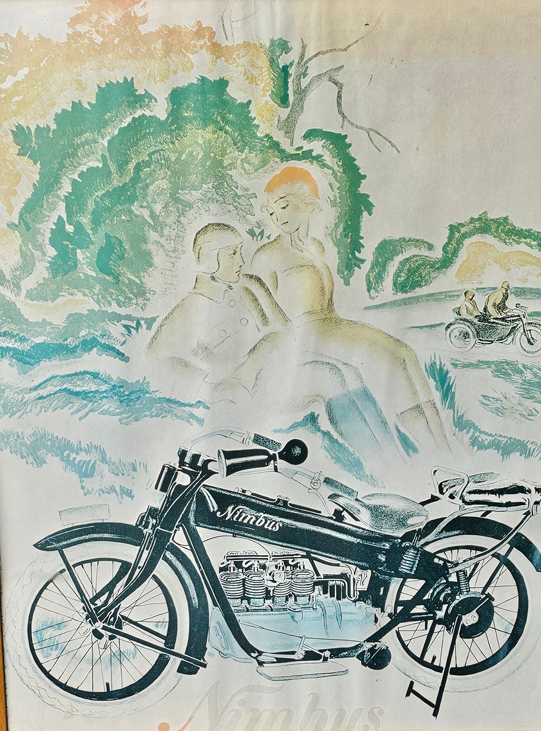 Beskrivelse: Reklame plakat i lys træramme for Fisker og Nielsens første Nimbus model