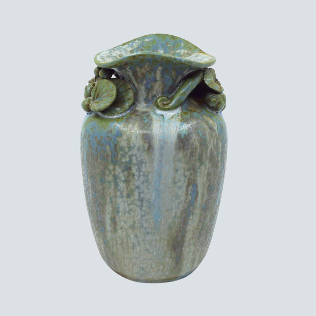 Description: Arne Bang; Vase of stoneware, decorated with flowers. In blue-green glaze. In good condition. H. 14.8 cm. W. 9 cm.