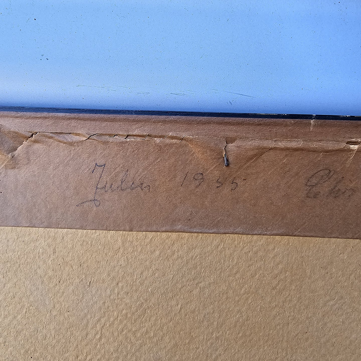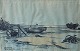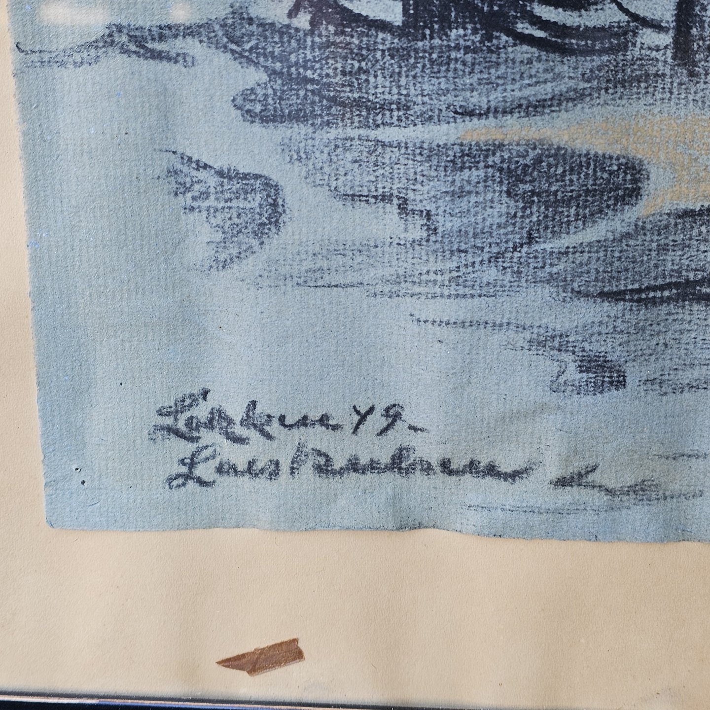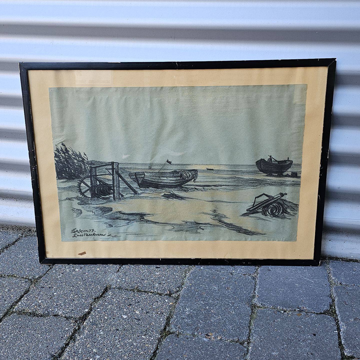 Beskrivelse: Kul eller kridt tegning på papir med motiv af både på en strand i Løkken. Monteret i sortmalet træramme, dateret 1949