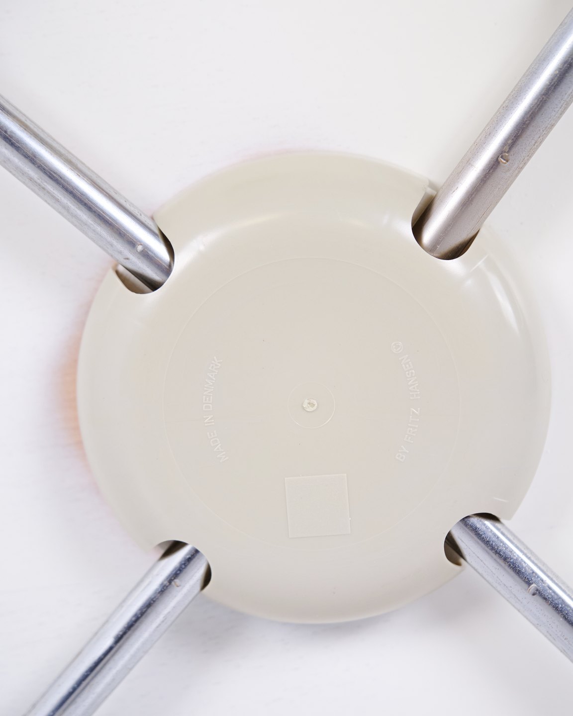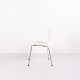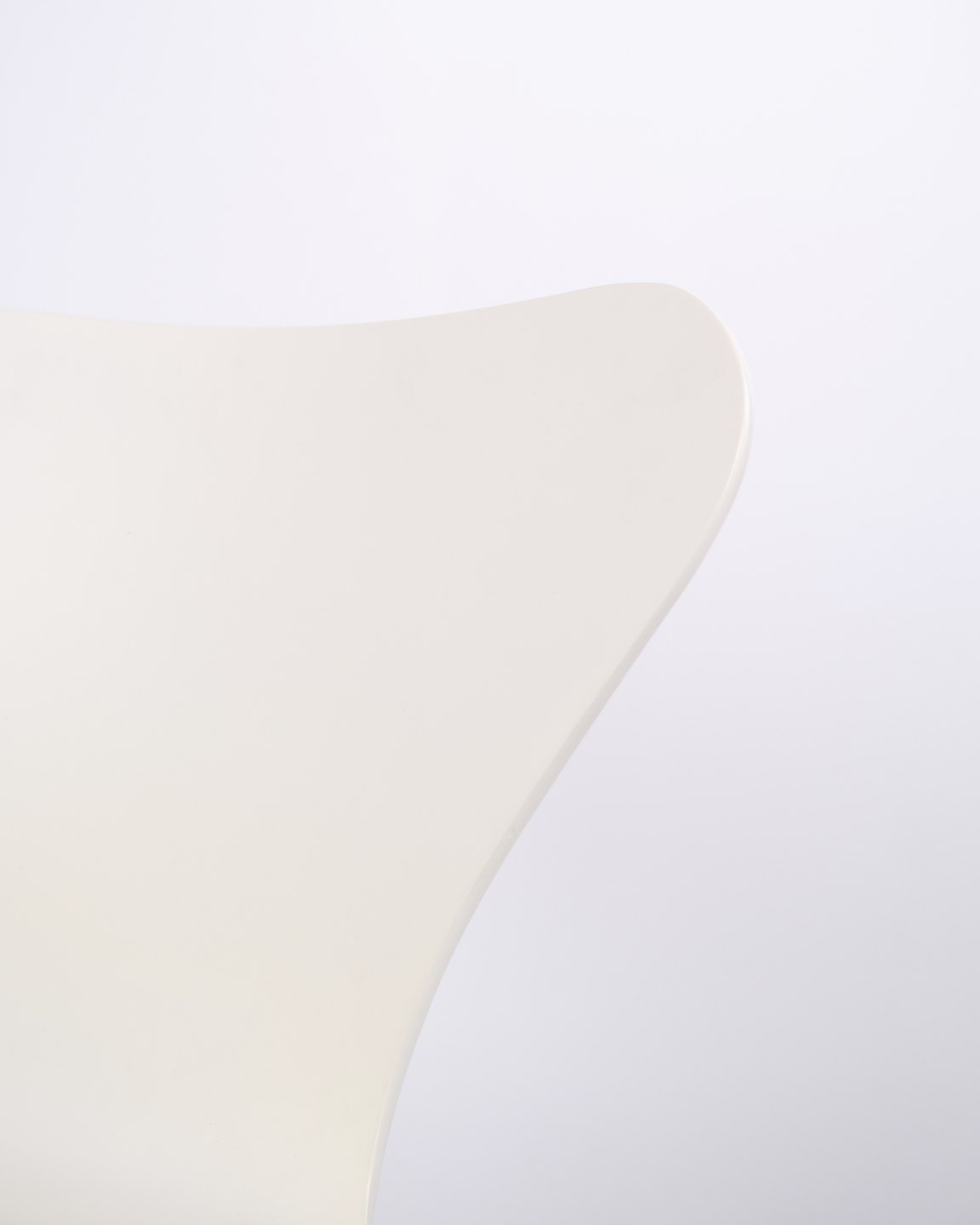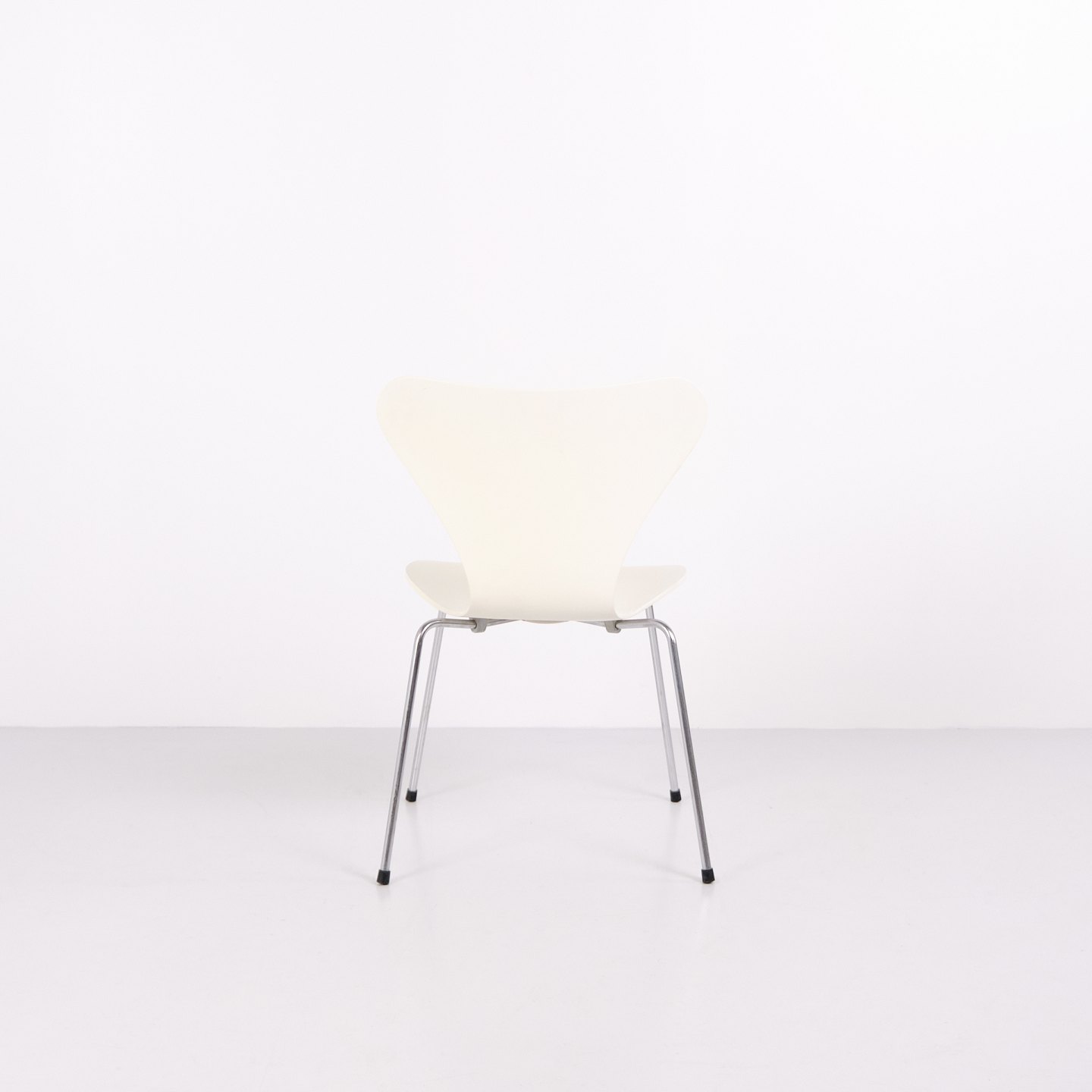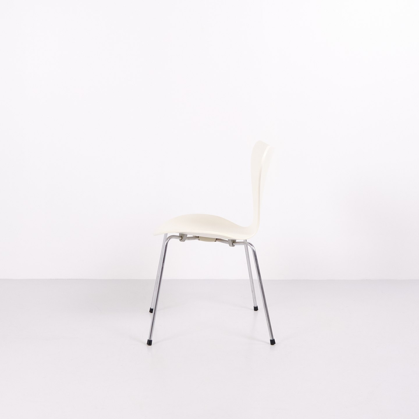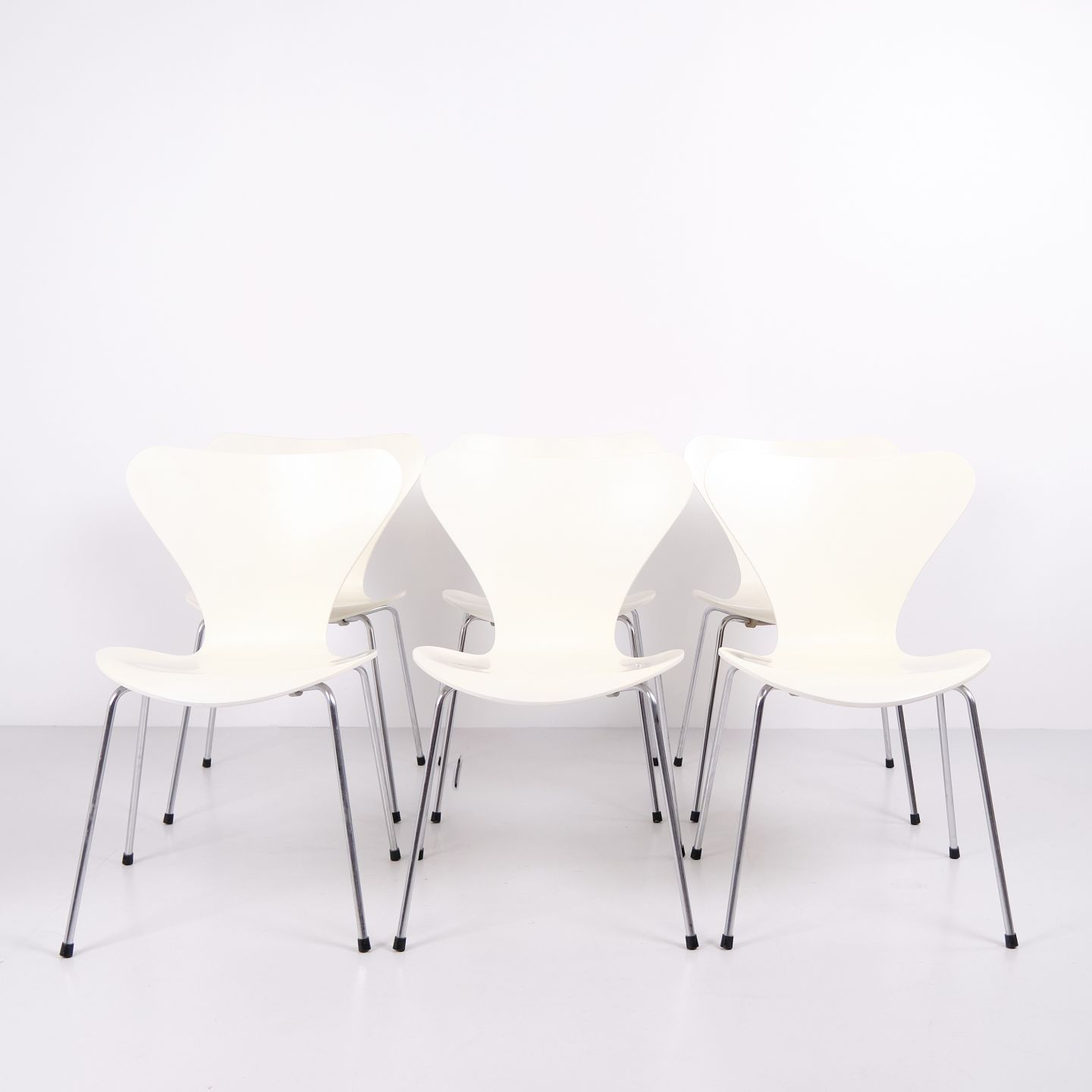 Beskrivelse: Sæt af 6 Syverstole model 3107 designet af Arne Jacobsen for Fritz Hansen. Modellen blev introduceret i 1955 og er en videreudvikling af Myren fra 1952. Stolen er udført i formspændt finér med hvidlakeret overflade og forkromet stålrørsstel. Den karakteristiske syvtalsform gjorde modellen til en af de mest producerede stole i dansk designhistorie. 3107 har været anvendt i private hjem, restauranter, kontorer og offentlige interiører verden over og produceres fortsat af Fritz Hansen. Sælges kun samlet.