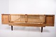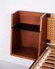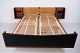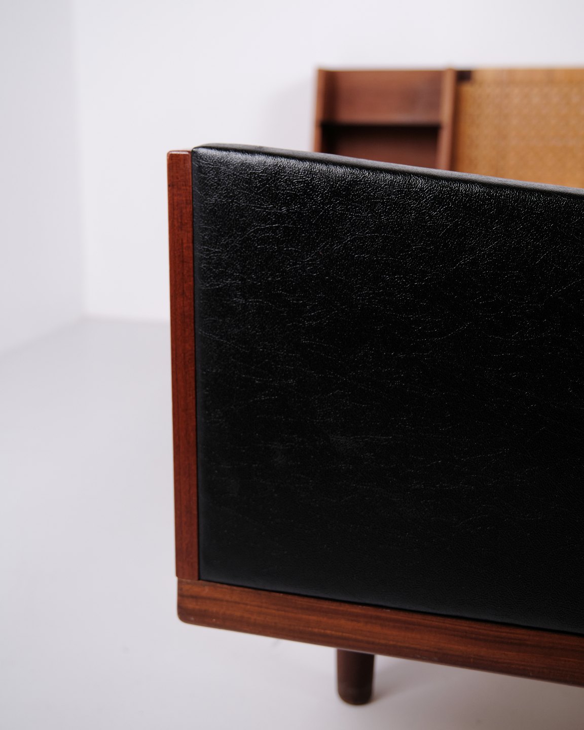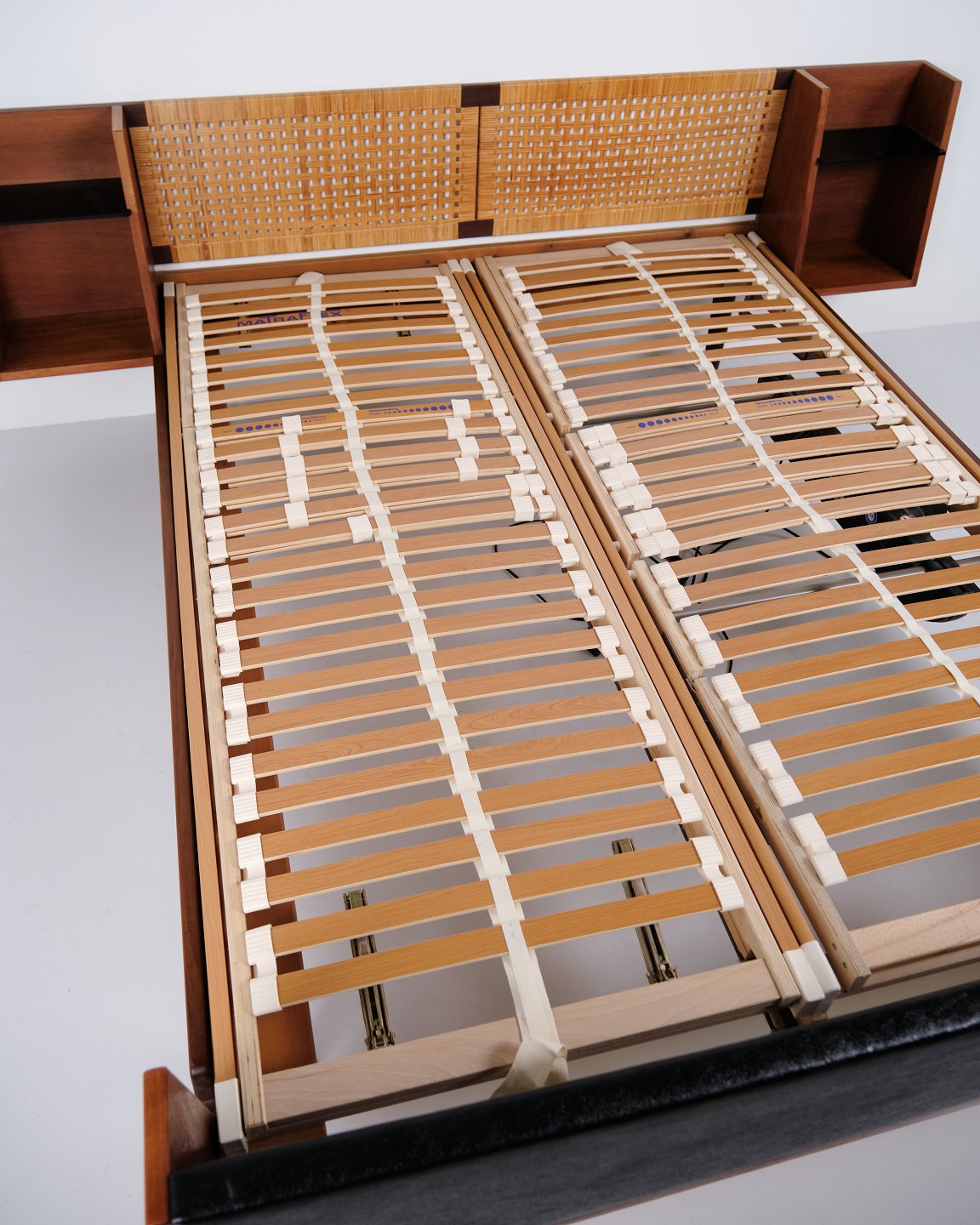 Beskrivelse: Model GE 701 dobbeltseng designet af Hans J. Wegner og fremstillet hos Getama i 1950’erne. Udført i fineret og massivt teaktræ. Gavle med sjeneflet og sort kunstlæder. Hovedgavl med integrerede sengeborde med hylder i sort glas samt underliggende hylde. Messingbeslag. Hans J. Wegner samarbejdede gennem mange år med Getama og udviklede flere møbler i teak til boligindretning og soveværelse.