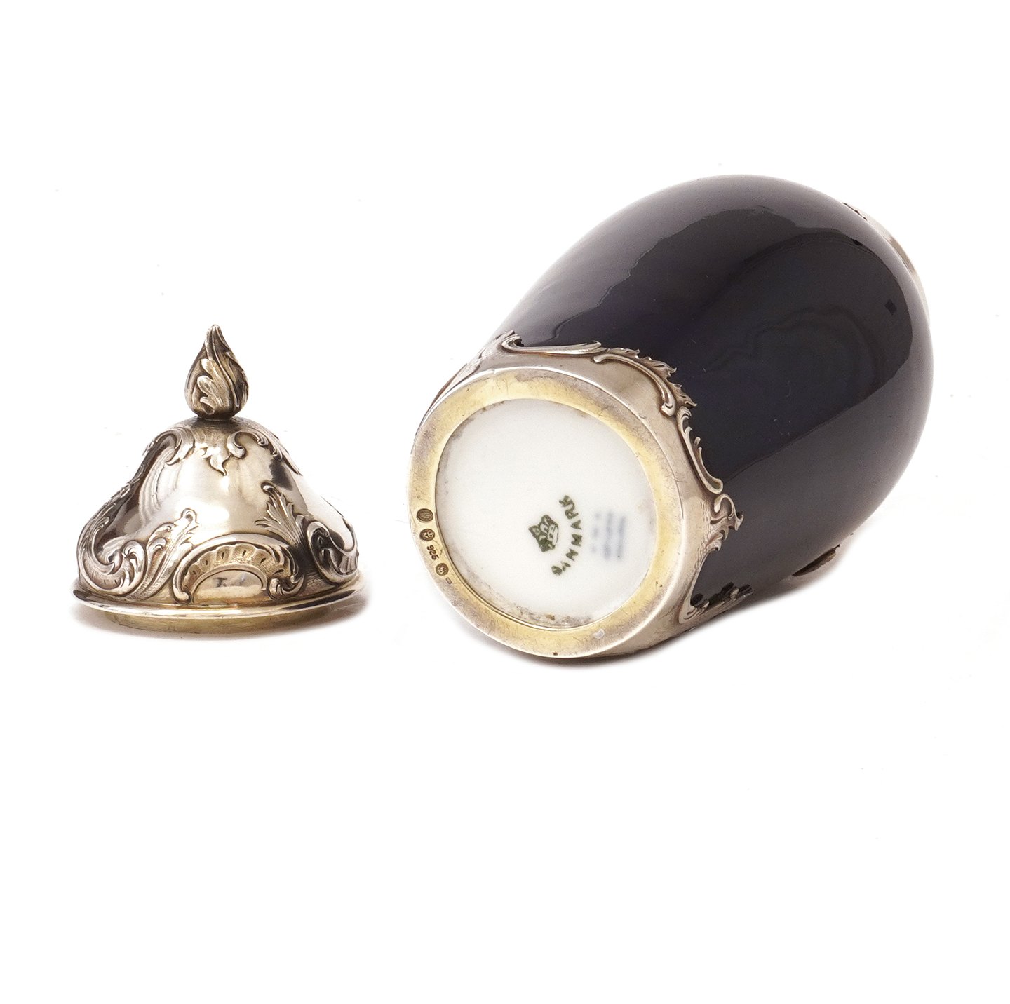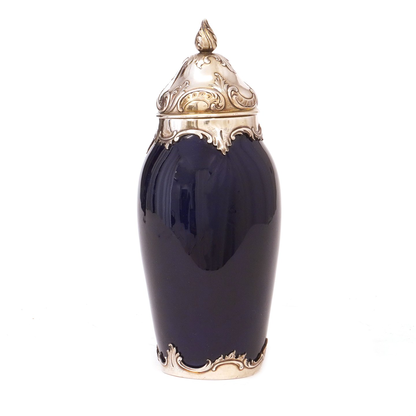 Beskrivelse: Tidlig Royal Copenhagen dybblå porcelænsvase med sølvmontering af A. Michelsen dateret 1903