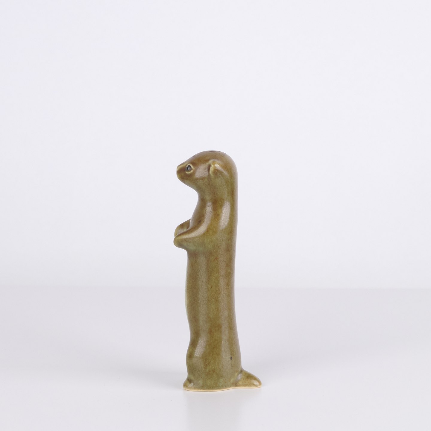 Beskrivelse: Dyrefigur af Knud Basse udført i glaseret keramik. Figuren forestiller fritte eller hermelin og er fremstillet i Danmark i 1960’erne. Knud Basse er kendt for keramiske dyrefigurer med naturmotiver og mindre serier produceret i perioden.
