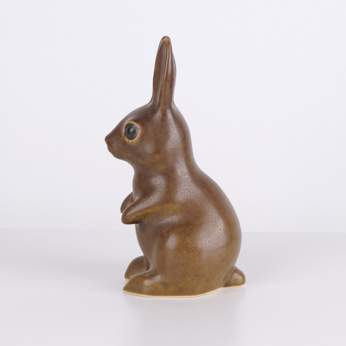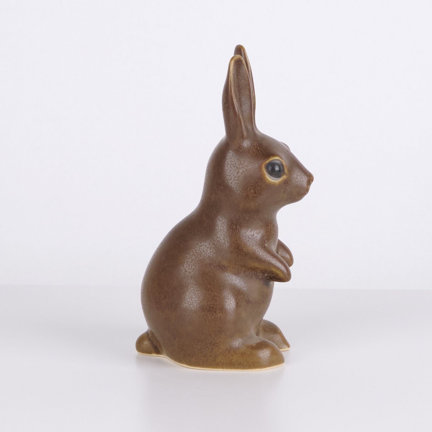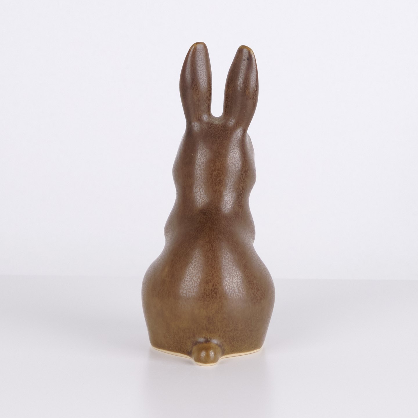 Beskrivelse: Stor harefigur af Knud Basse udført i brun glaseret keramik. Figuren er modelleret i opret siddende form med lange ører og fine håndmalede øjne.