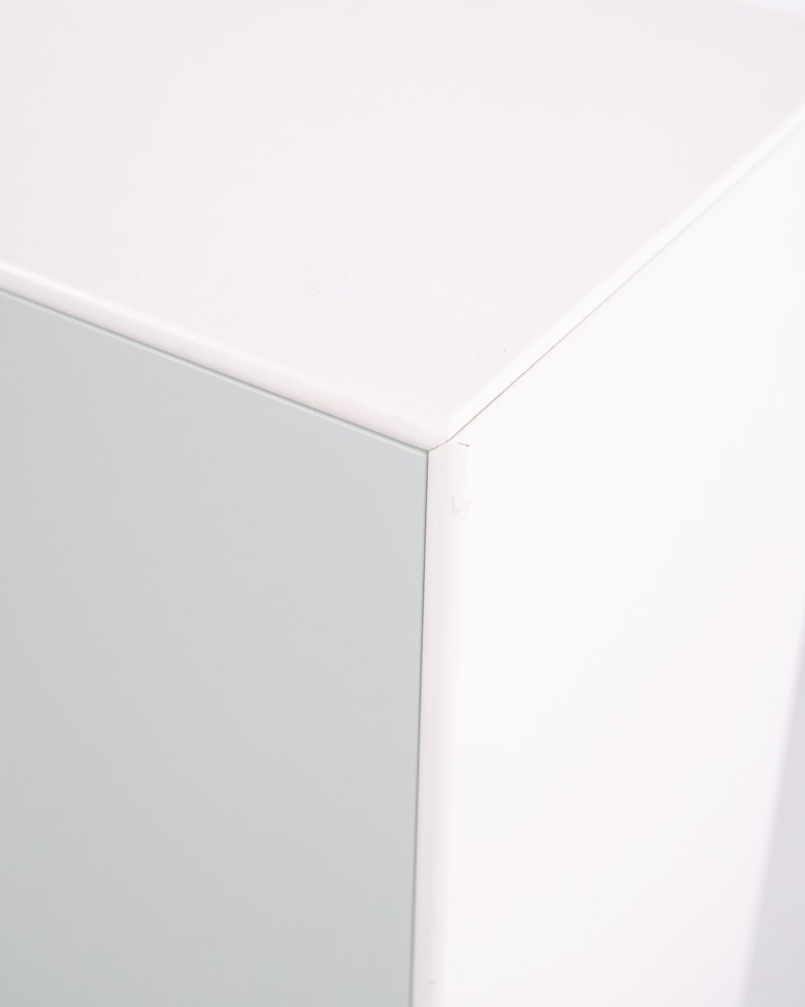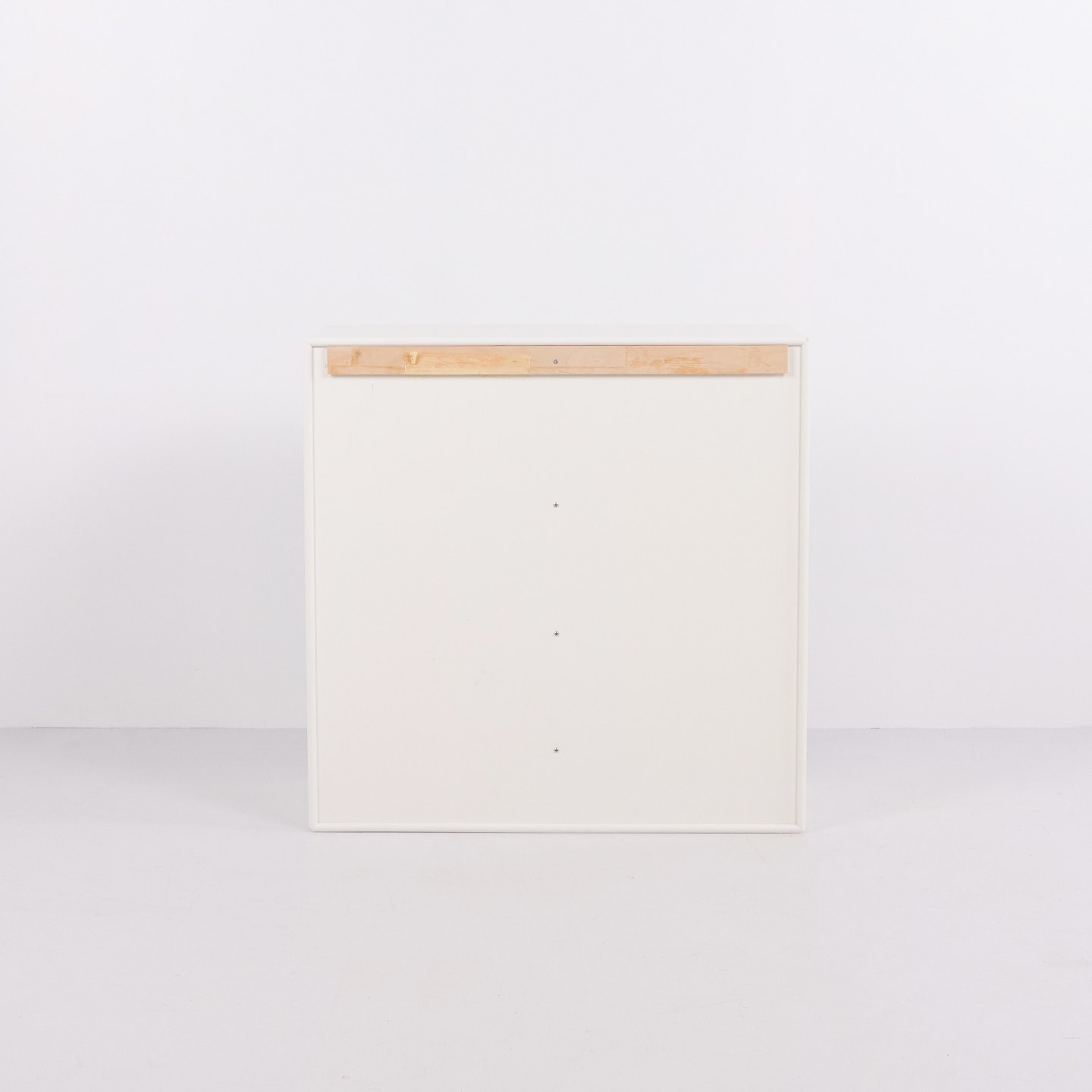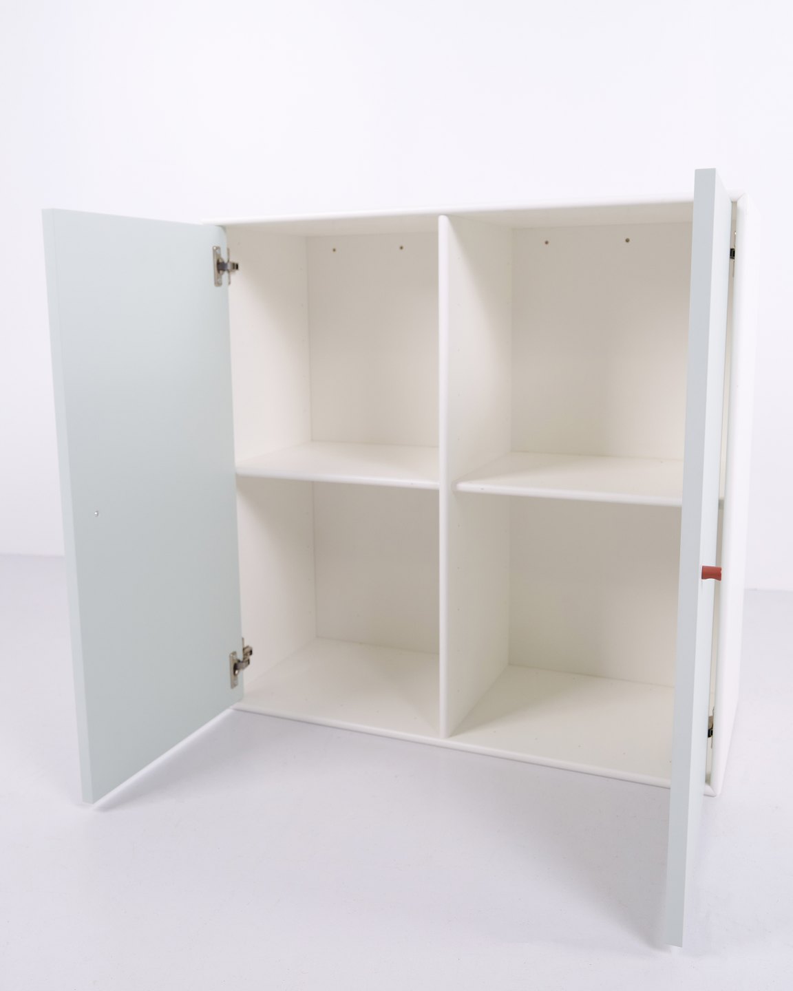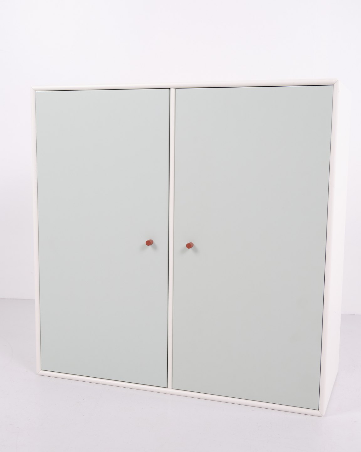 Beskrivelse: Montana skabmodul fra det modulære Montana System designet af Peter J. Lassen. Udført i lakeret MDF med hvid korpus, to mintgrønne låger og brune greb. Montana blev grundlagt i 1982 og er kendt for fleksible opbevaringsmoduler produceret i Danmark. Modellen kan anvendes som vægskab, entrémøbel, badeværelsesskab eller del af større Montana reolsystem. Montana fremstilles fortsat på Fyn og er kendt for høj finish samt stort farveudvalg.