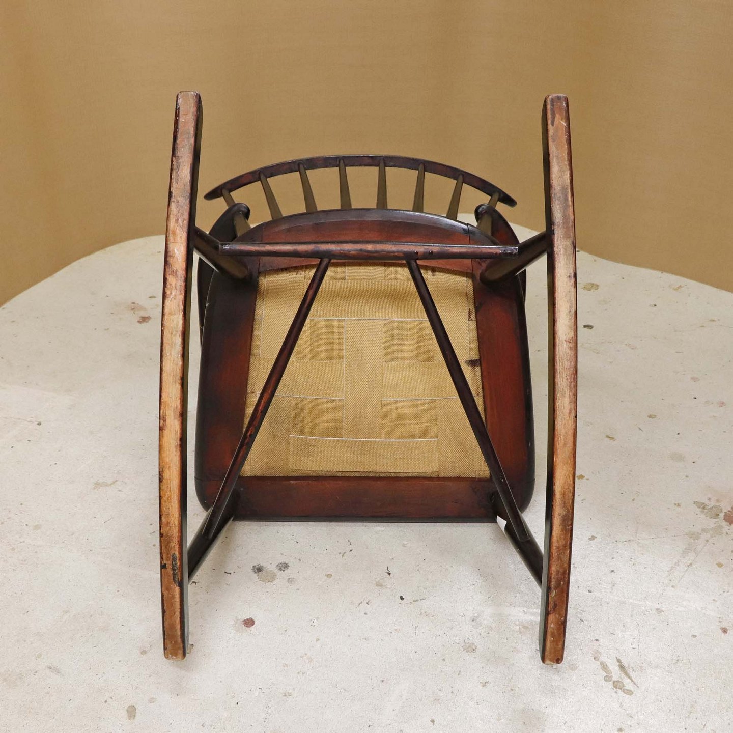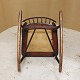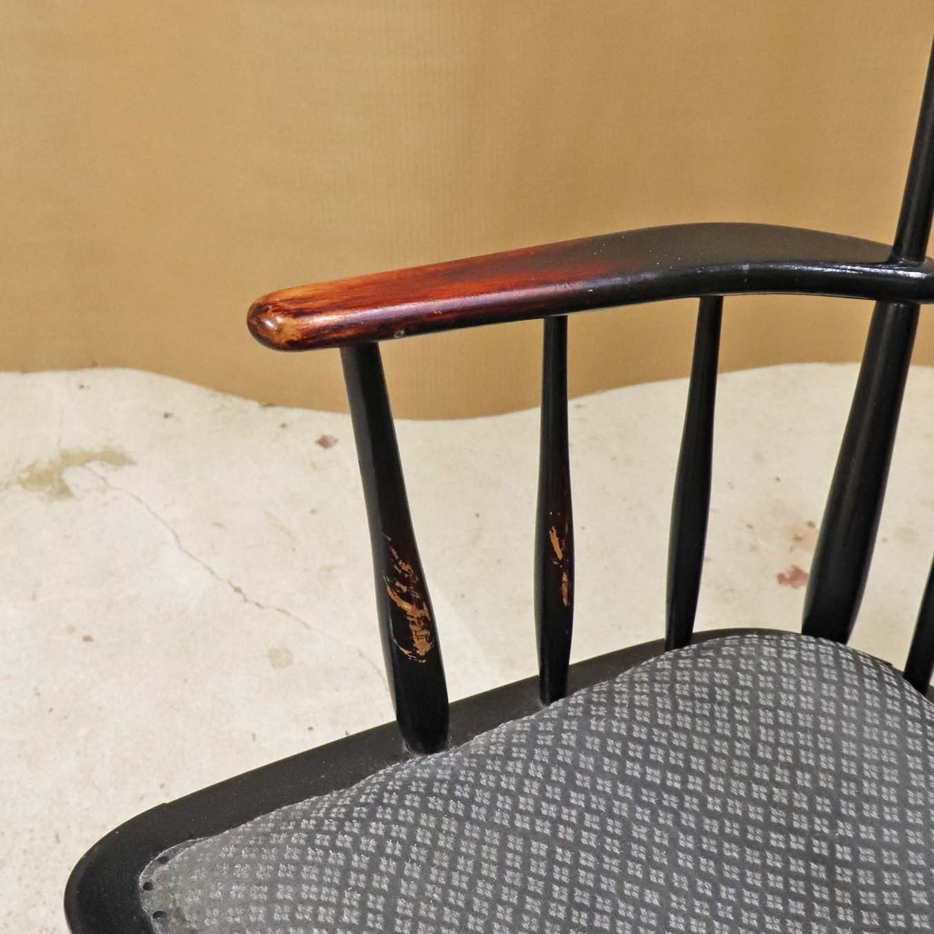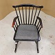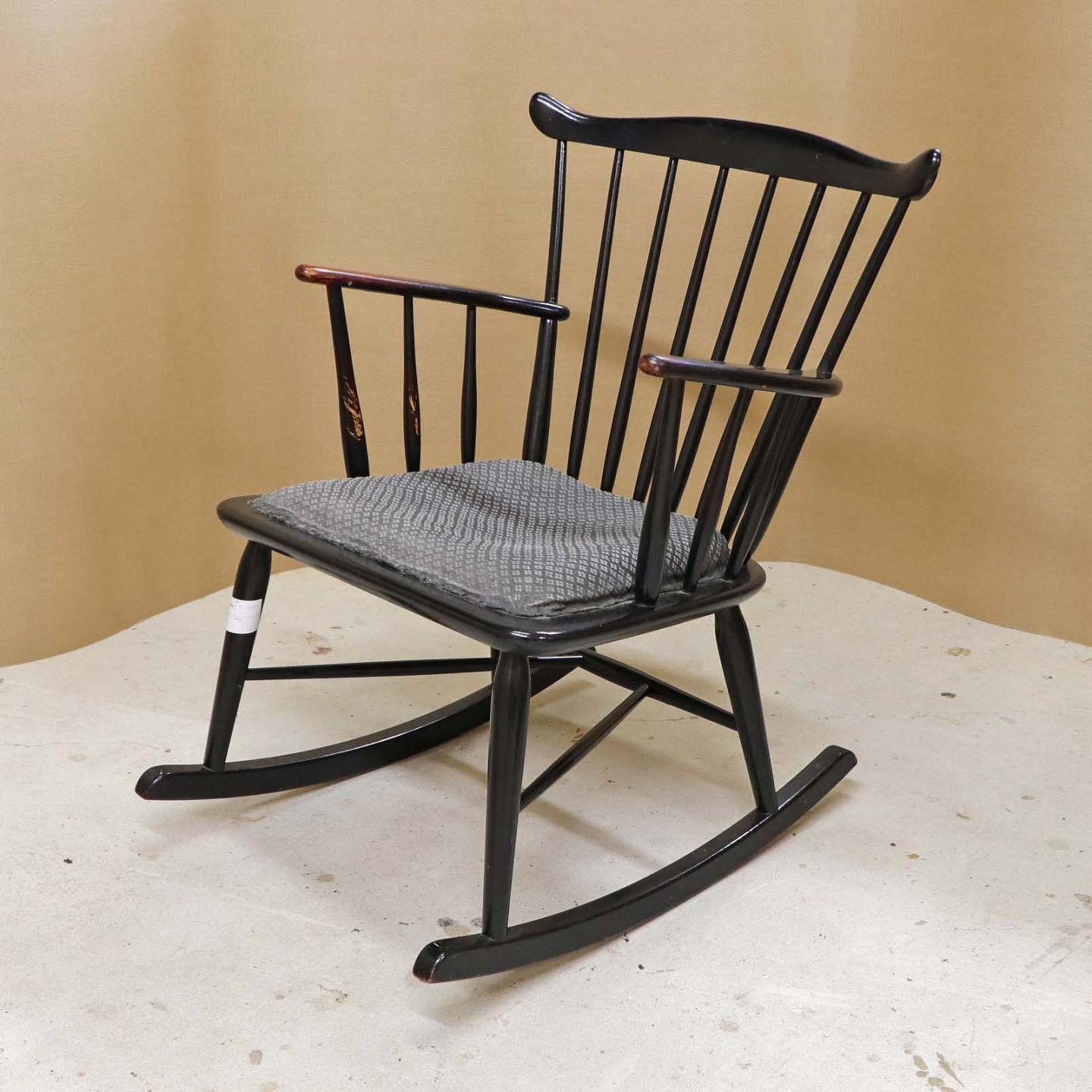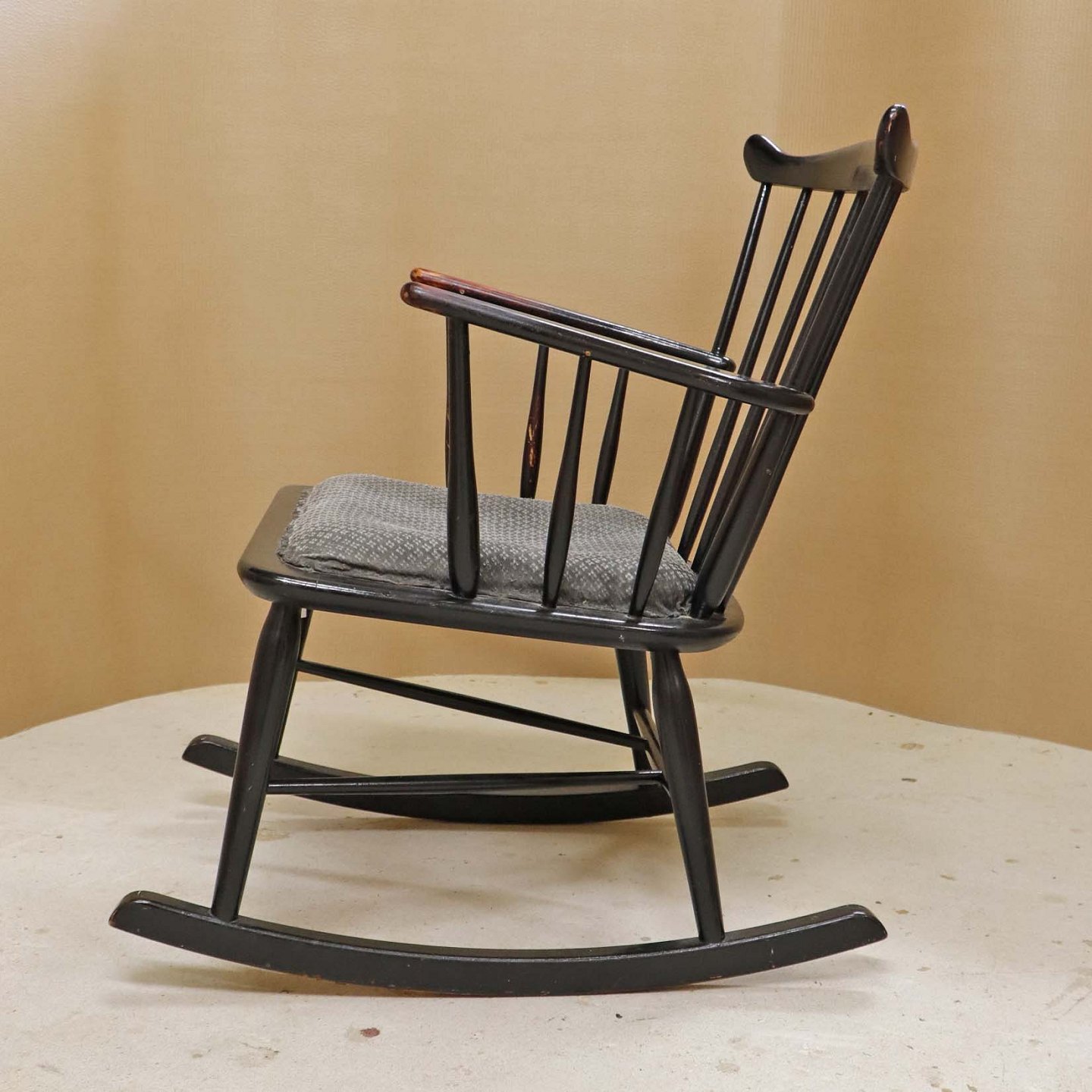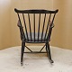 Beskrivelse: Tremme gyngestol i sortlakeret træ med fastmonteret polstret stofbetrukket sæde i grå farve med lyst mønster. Model 181