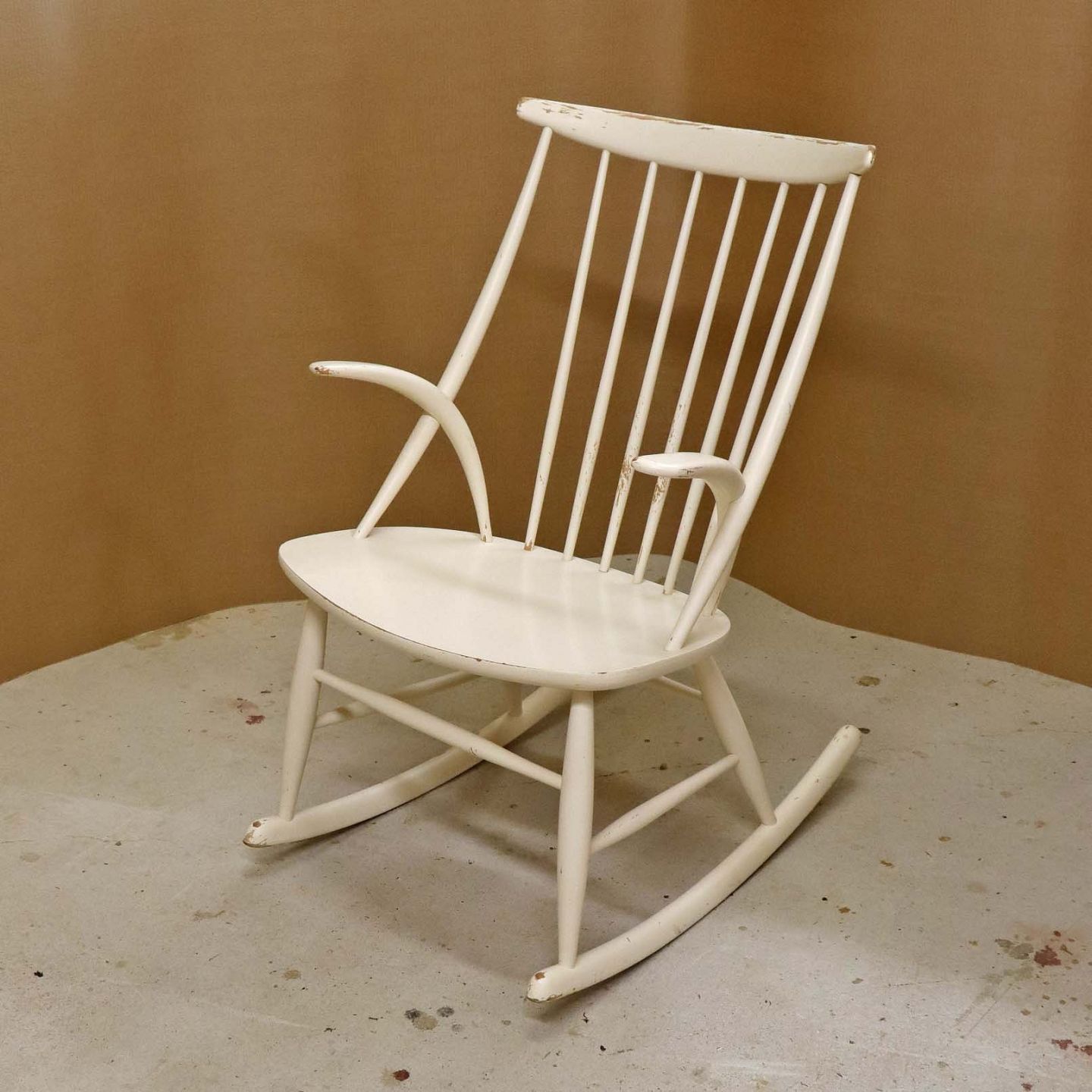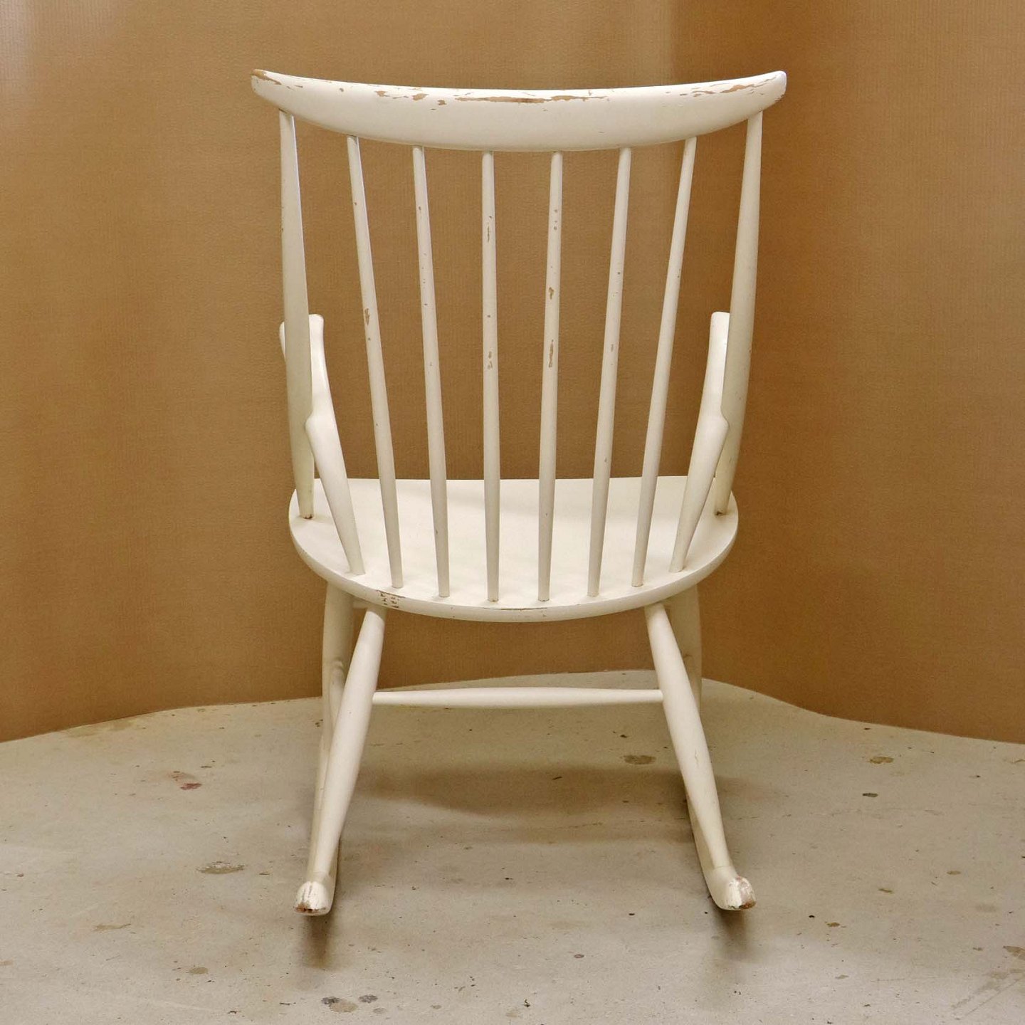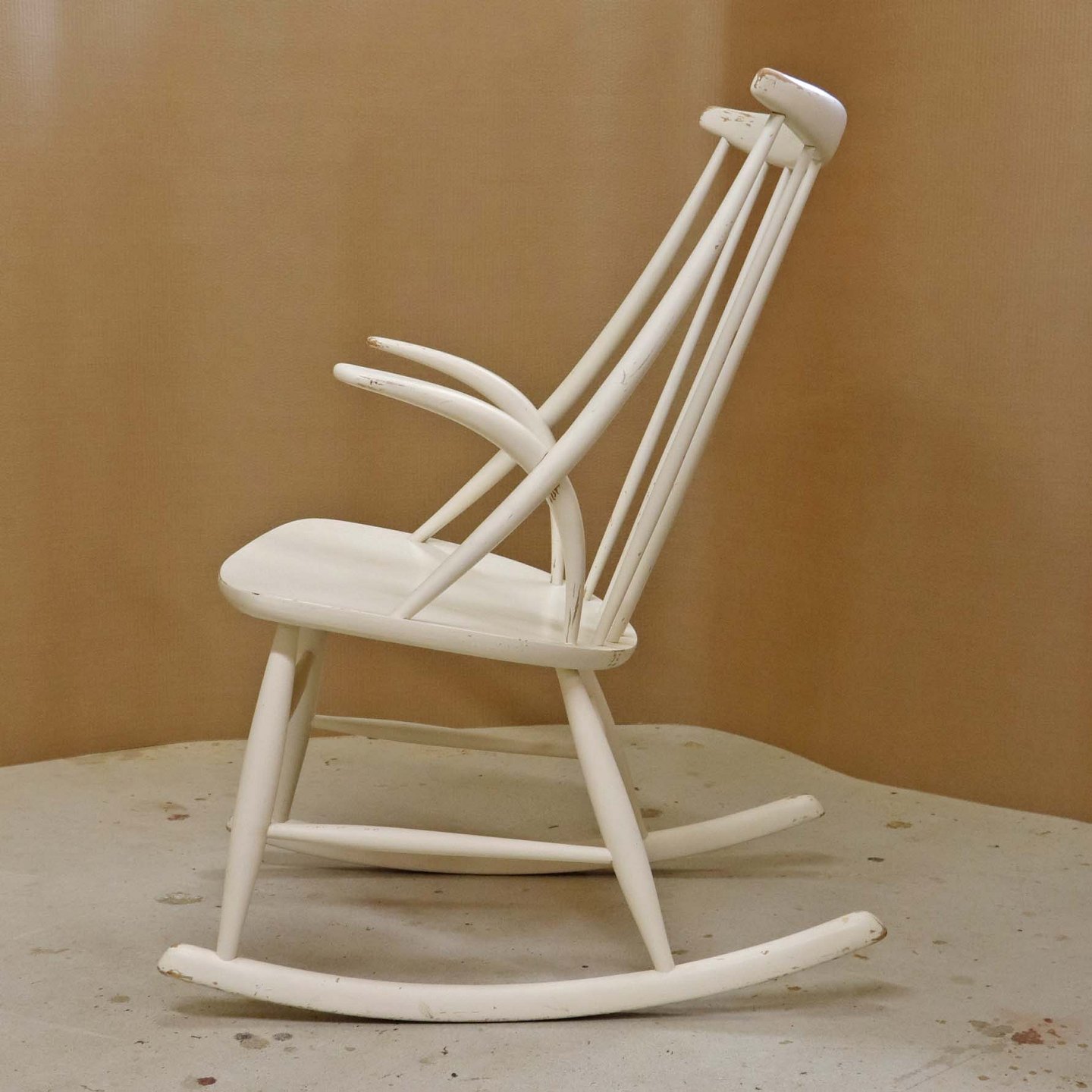 Beskrivelse: Tremme gyngestol formgivet år 1958 i hvidlakeret træ. Model IW3