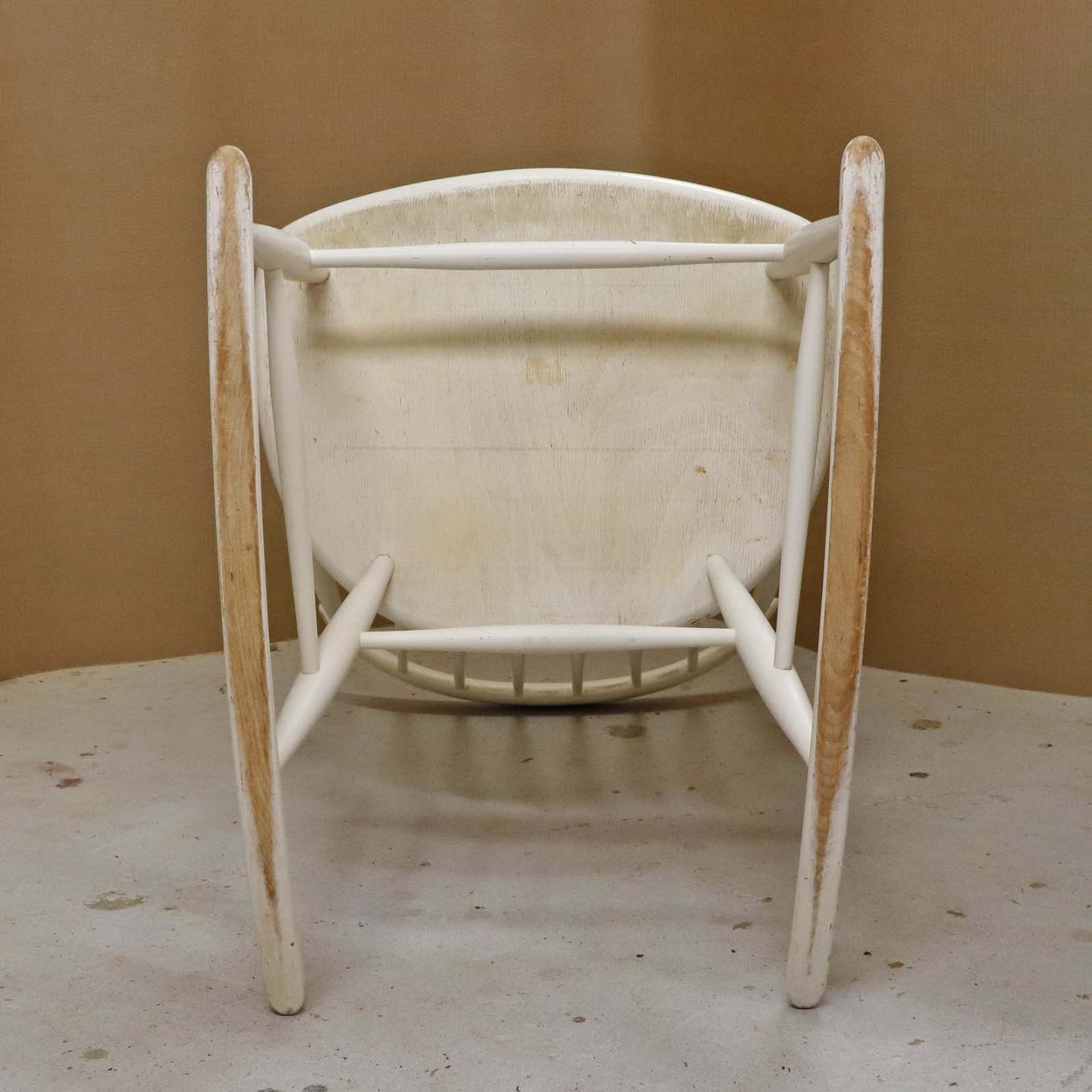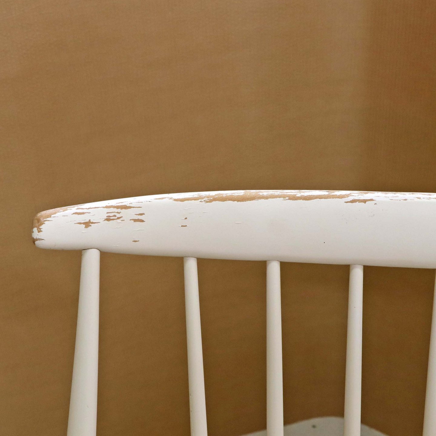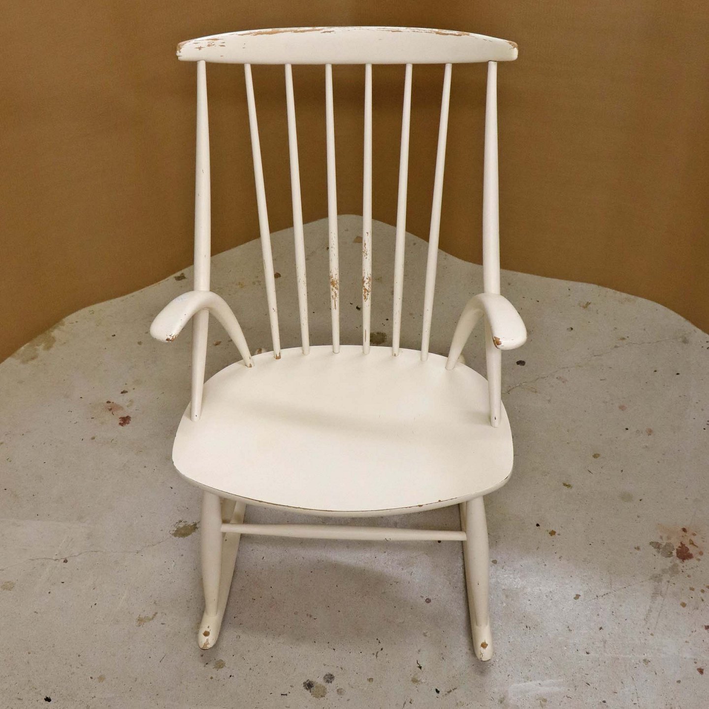 Beskrivelse: Tremme gyngestol formgivet år 1958 i hvidlakeret træ. Model IW3