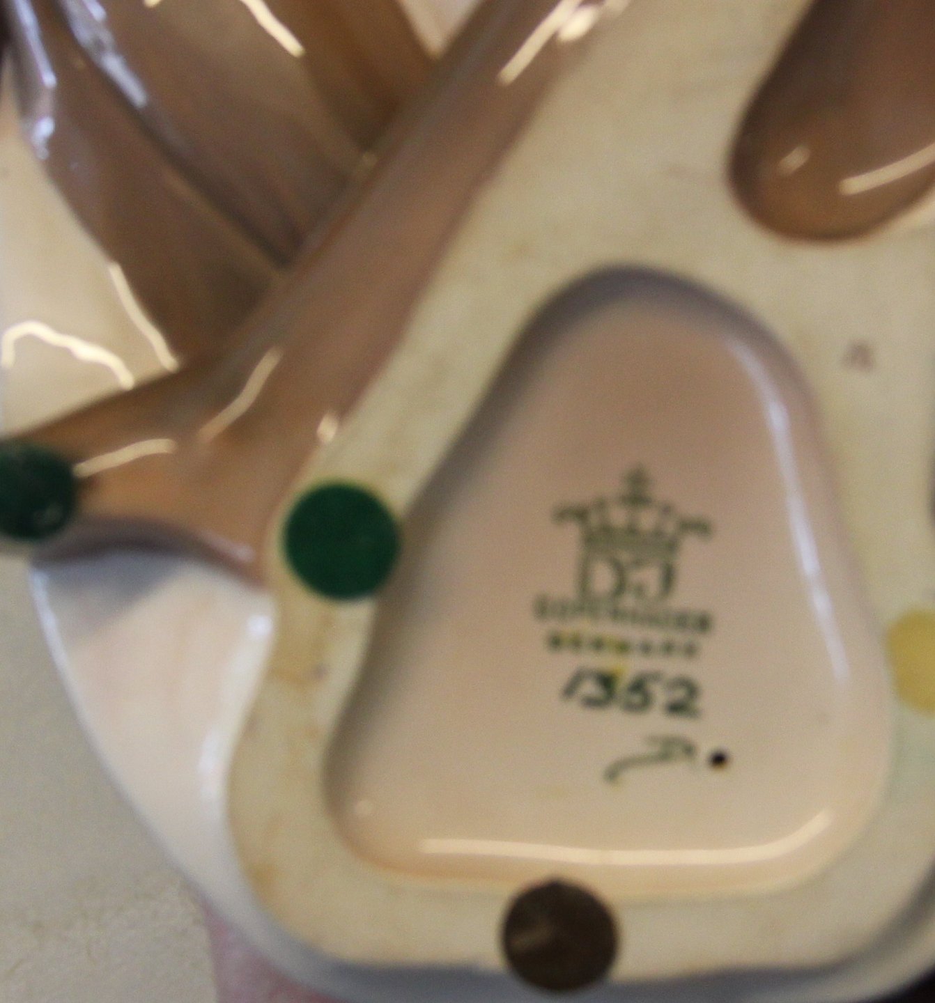 Beskrivelse: Dahl Jensen 1352 Orientalsk danserinde 21 cm (DJ). Mærket med kongelig krone og DJ Copenhagen i hel og fin stand.