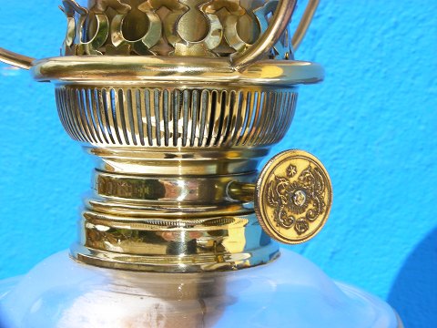 Beskrivelse: Petroleums bordlampe med fod af guldbemalet jern, glasbeholder og fin gammel opalinekuppel fra Holmegaard. Højde 57cm. Fin stand. Klitsantik garanterer for funktionaliteten.
