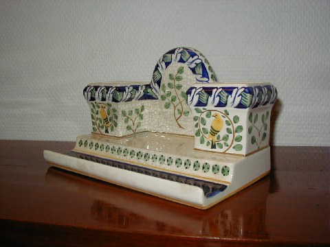 Beskrivelse: Et utroligt smukt Aluminia Blækhus dekoreret med fuglemotiver. Det har nummer 474/513 og måler 19,5 x 11 cm. Højde 11,5 cm. Fremstår i flot stand, dog med krakkeleringer.
